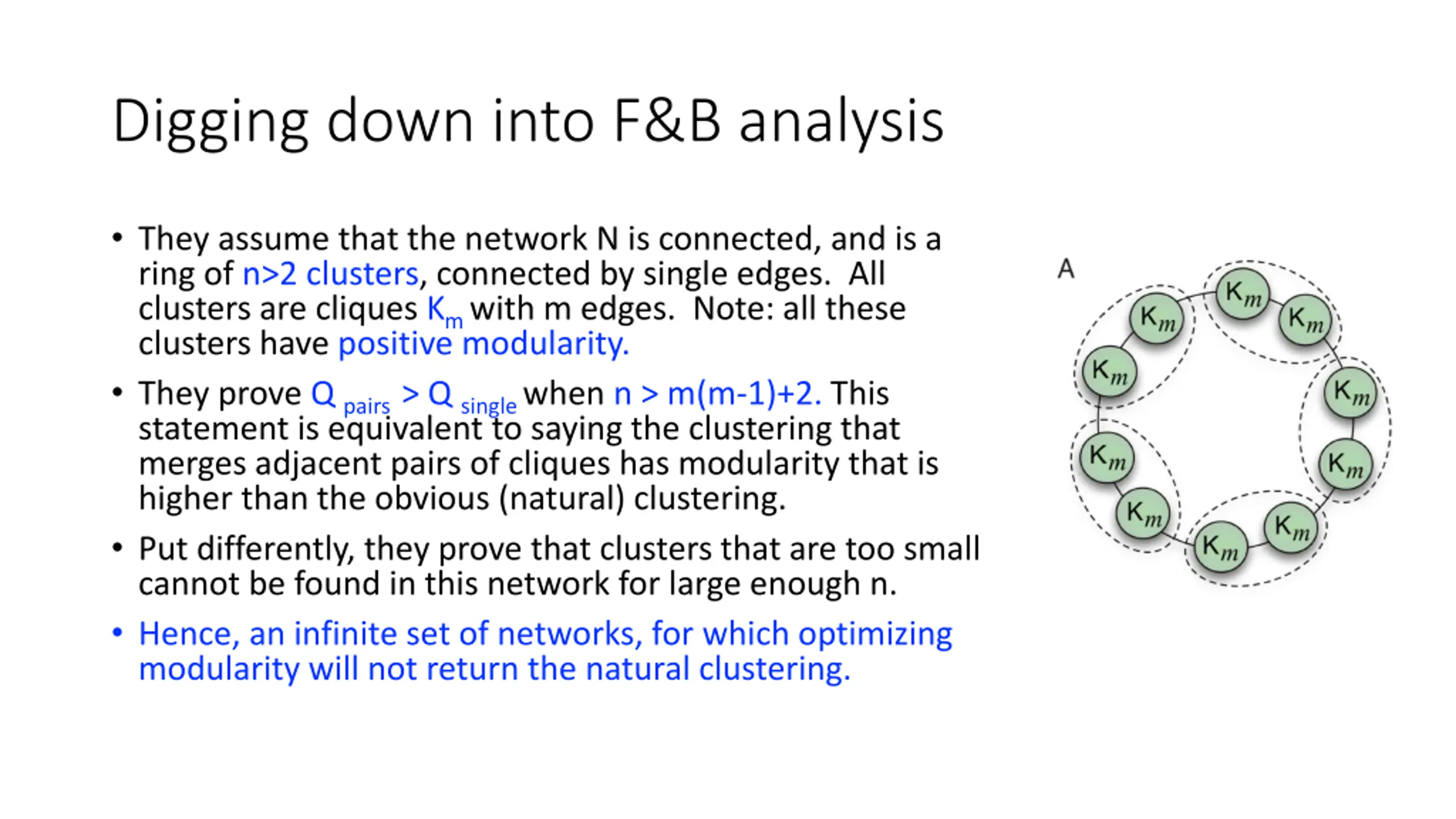 Digging down into F&B analysis They assume that the network N is connected, and is a ring of n>2 clusters, connected by single edges. All clusters are cliques Km with m edges. Note: all these clusters have positive modularity. They prove Q pairs > Q single when n > m(m-1)+2. This statement is equivalent to saying the clustering that merges adjacent pairs of cliques has modularity that is higher than the obvious (natural) clustering. Put differently, they prove that clusters that are too small cannot be found in this network for large enough n. Hence, an infinite set of networks, for which optimizing modularity will not return the natural clustering.