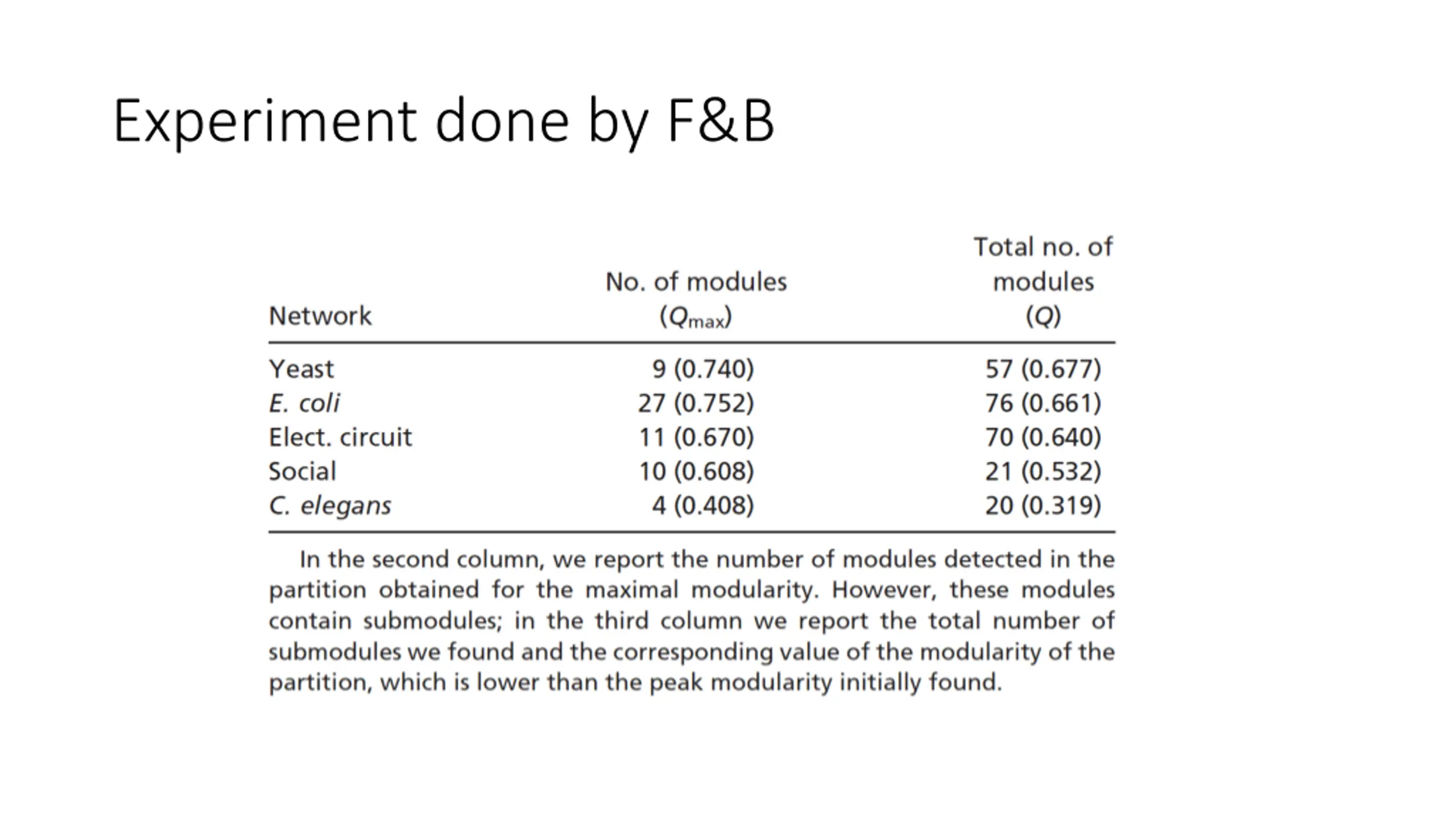 Modularity optimization Modularity optimization seeks a partition of the vertices into disjoint sets (i.e., clusters) so that the sum of the modularity scores of each cluster is maximized Any cluster/module with positive modularity is considered actual (equivalently, real, valid, etc.) F&B (Fortunato and Barth lemy) proved that optimizing modularity has a resolution limit modules below a threshold will not be found. See https://en.wikipedia.org/wiki/Modularity_(networks) for additional references.