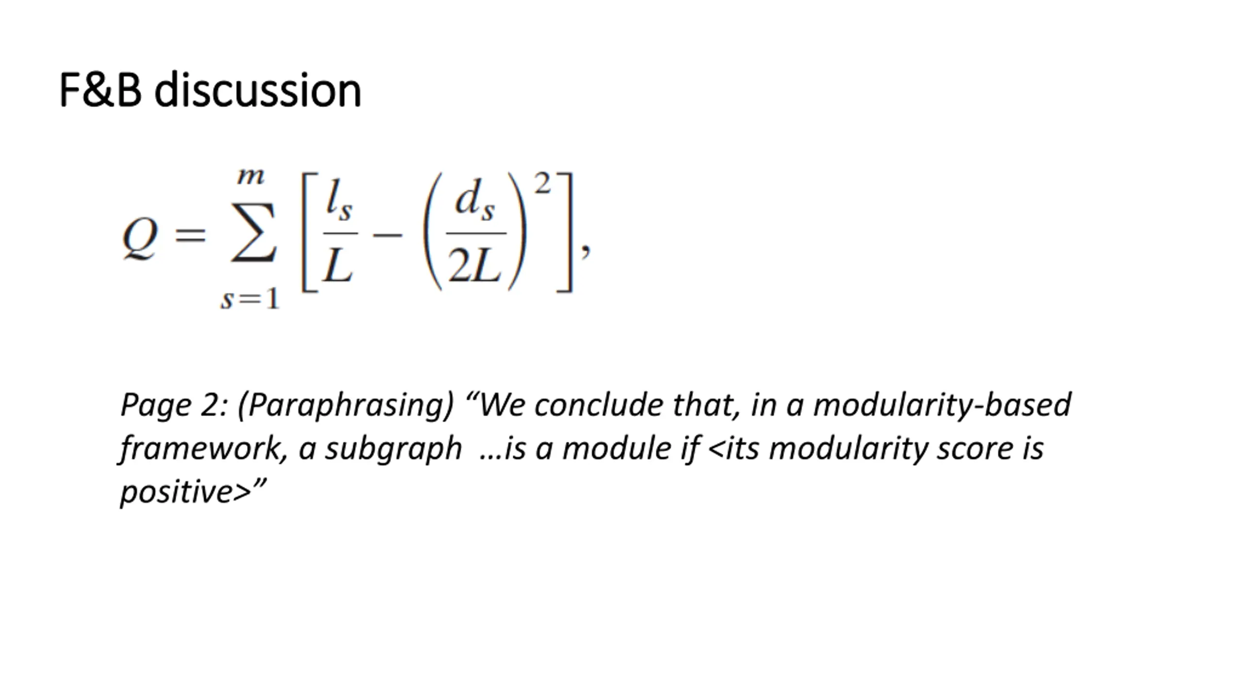 F&B discussion F&B discussion Page 2: (Paraphrasing) We conclude that, in a modularity-based framework, a subgraph is a module if <its modularity score is positive>