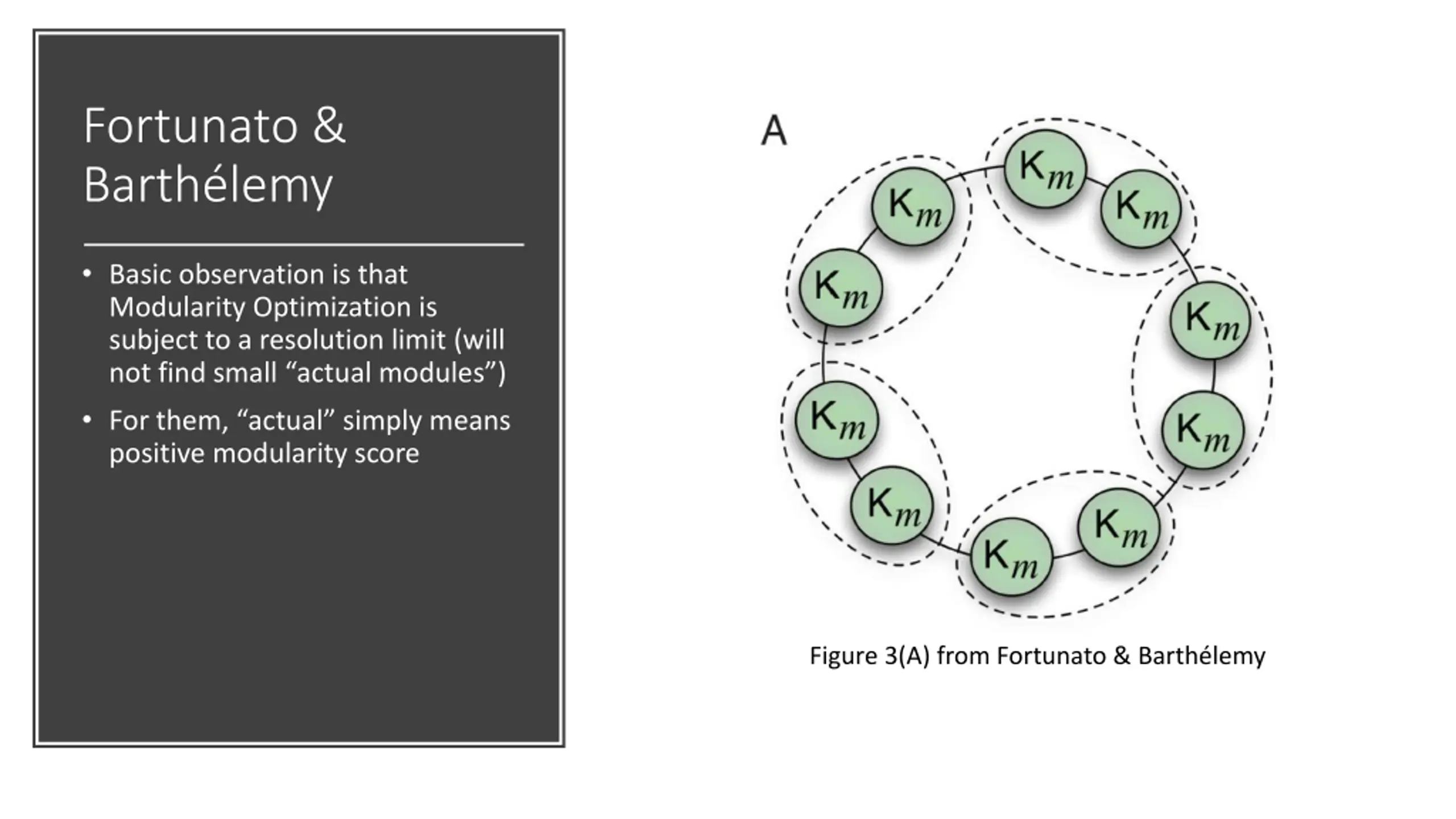 Fortunato & Barth lemy Basic observation is that Modularity Optimization is subject to a resolution limit (will not find small actual modules ) For them, actual simply means positive modularity score Figure 3(A) from Fortunato & Barth lemy