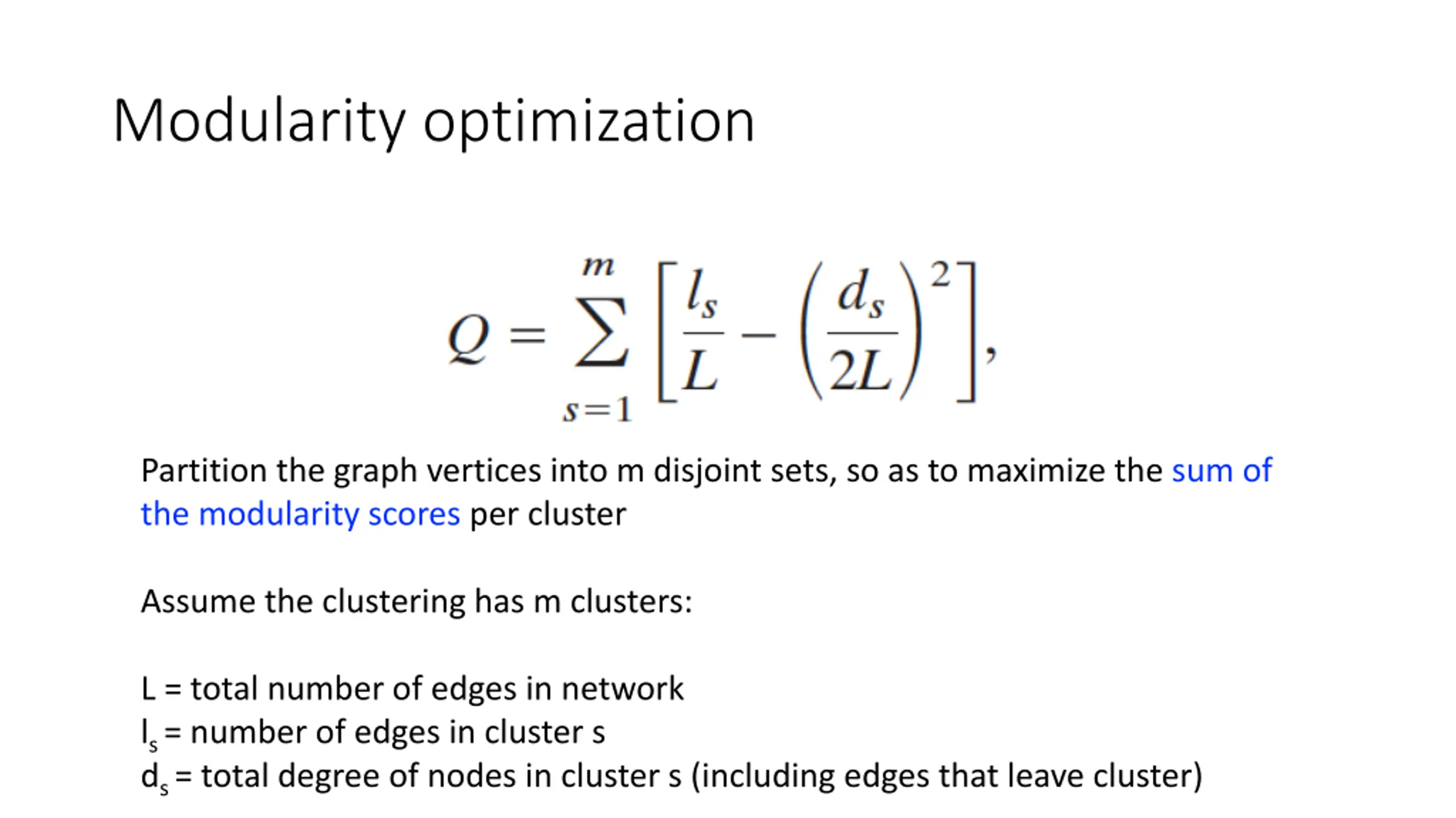 Modularity optimization Partition the graph vertices into m disjoint sets, so as to maximize the sum of the modularity scores per cluster Assume the clustering has m clusters: L = total number of edges in network ls = number of edges in cluster s ds = total degree of nodes in cluster s (including edges that leave cluster)