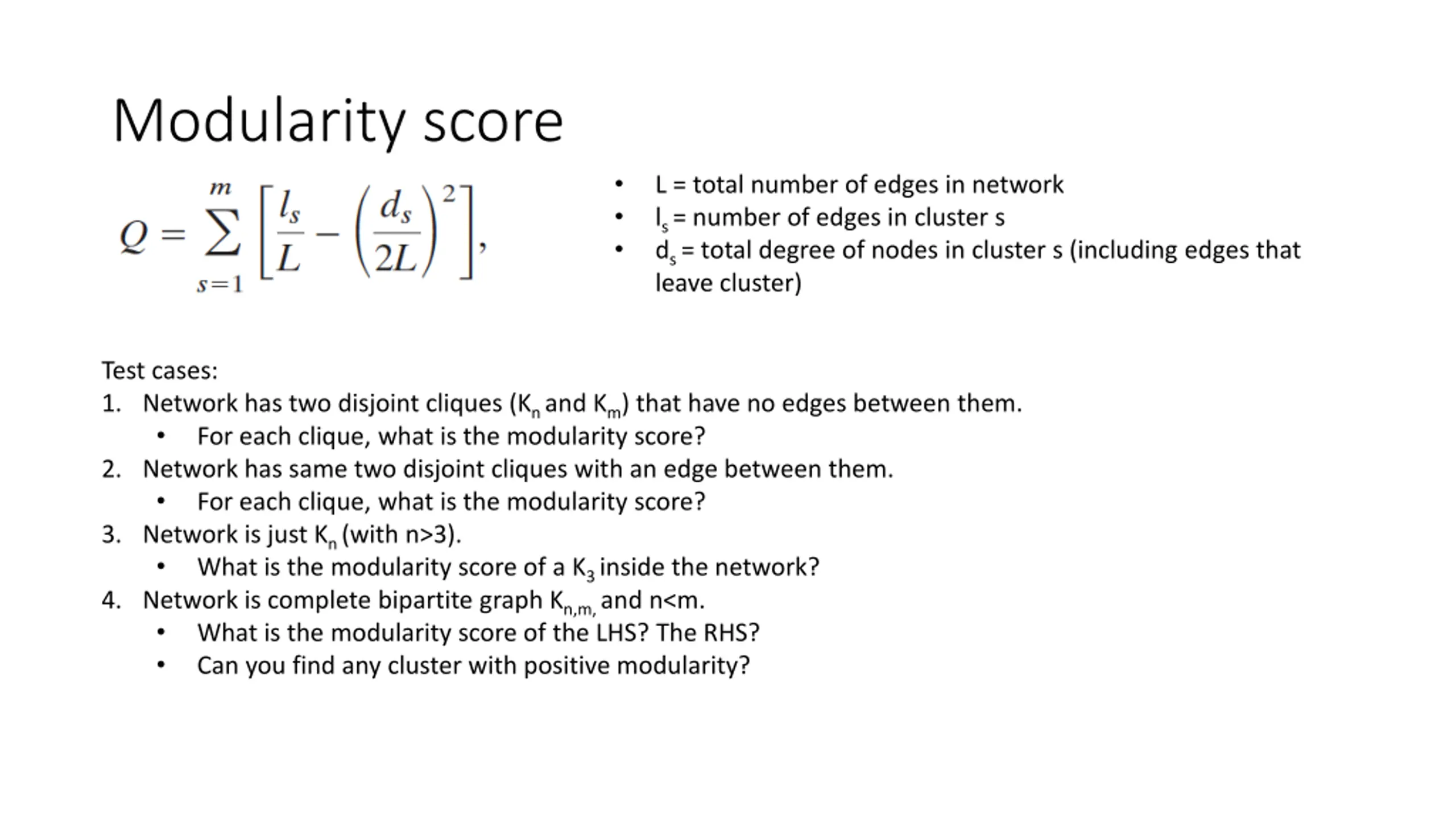 Modularity score L = total number of edges in network ls = number of edges in cluster s ds = total degree of nodes in cluster s (including edges that leave cluster) Test cases: For each network and each suggested clustering, calculate the modularity score. 1. Network has two disjoint cliques (Kn and Km), n<m, that have no edges between them. Clustering: the two cliques 2. Network has same two disjoint cliques with an edge between them. Clustering: the two cliques 3. Network has same two disjoint cliques with all nodes in Kn adjacent to the same single node x in Km. Clustering: the two cliques What if n>m?