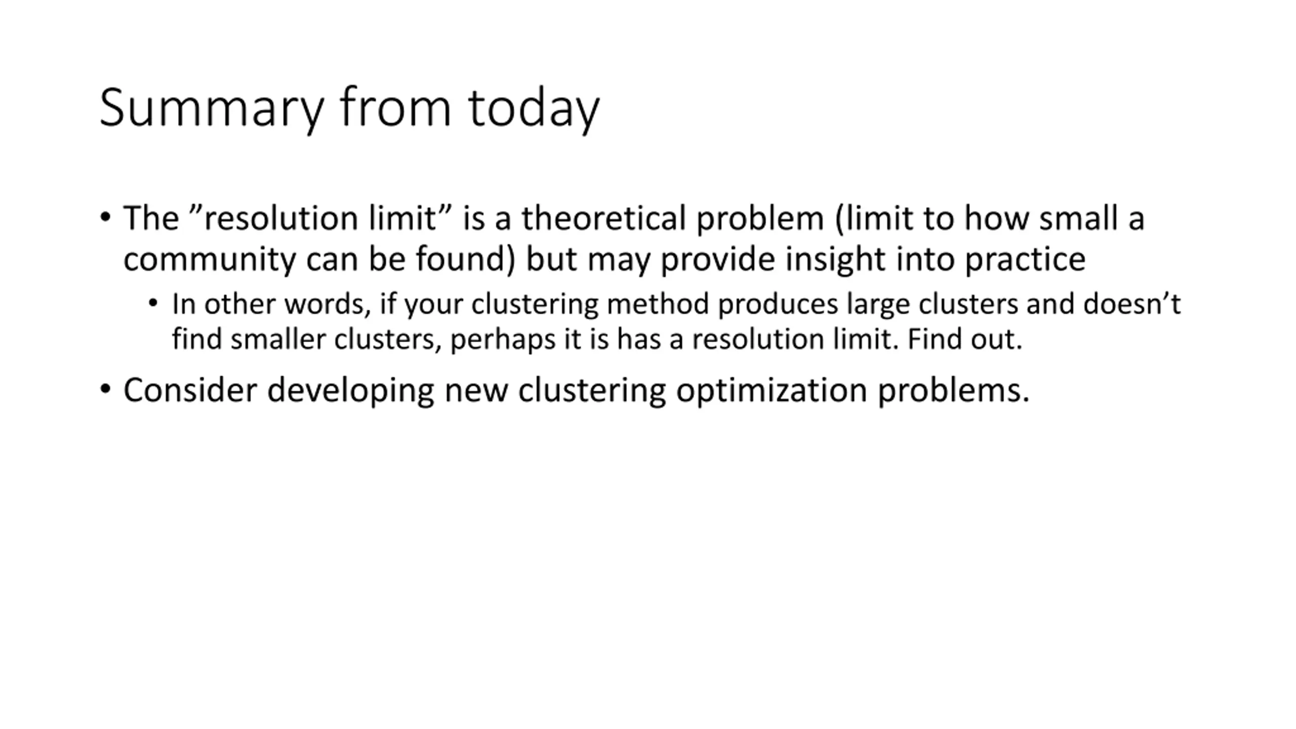 Summary from today The resolution limit is a theoretical problem (limit to how small a community can be found) but may provide insight into practice In other words, if your clustering method produces large clusters and doesn t find smaller clusters, perhaps it is has a resolution limit. Find out. Consider developing new clustering optimization problems.
