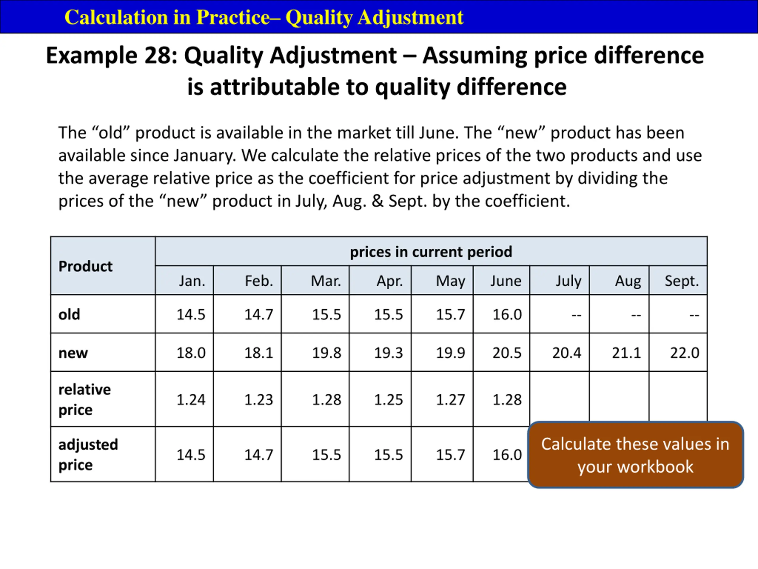 Calculation in Practice Quality Adjustment Example 28: Quality Adjustment Assuming price difference is attributable to quality difference The old product is available in the market till June. The new product has been available since January. We calculate the relative prices of the two products and use the average relative price as the coefficient for price adjustment by dividing the prices of the new product in July, Aug. & Sept. by the coefficient. prices in current period Product Jan. Feb. Mar. Apr. May June July Aug Sept. old 14.5 14.7 15.5 15.5 15.7 16.0 -- -- -- new 18.0 18.1 19.8 19.3 19.9 20.5 20.4 21.1 22.0 relative price 1.24 1.23 1.28 1.25 1.27 1.28 Calculate these values in your workbook adjusted price 14.5 14.7 15.5 15.5 15.7 16.0 16.2 16.8 17.5