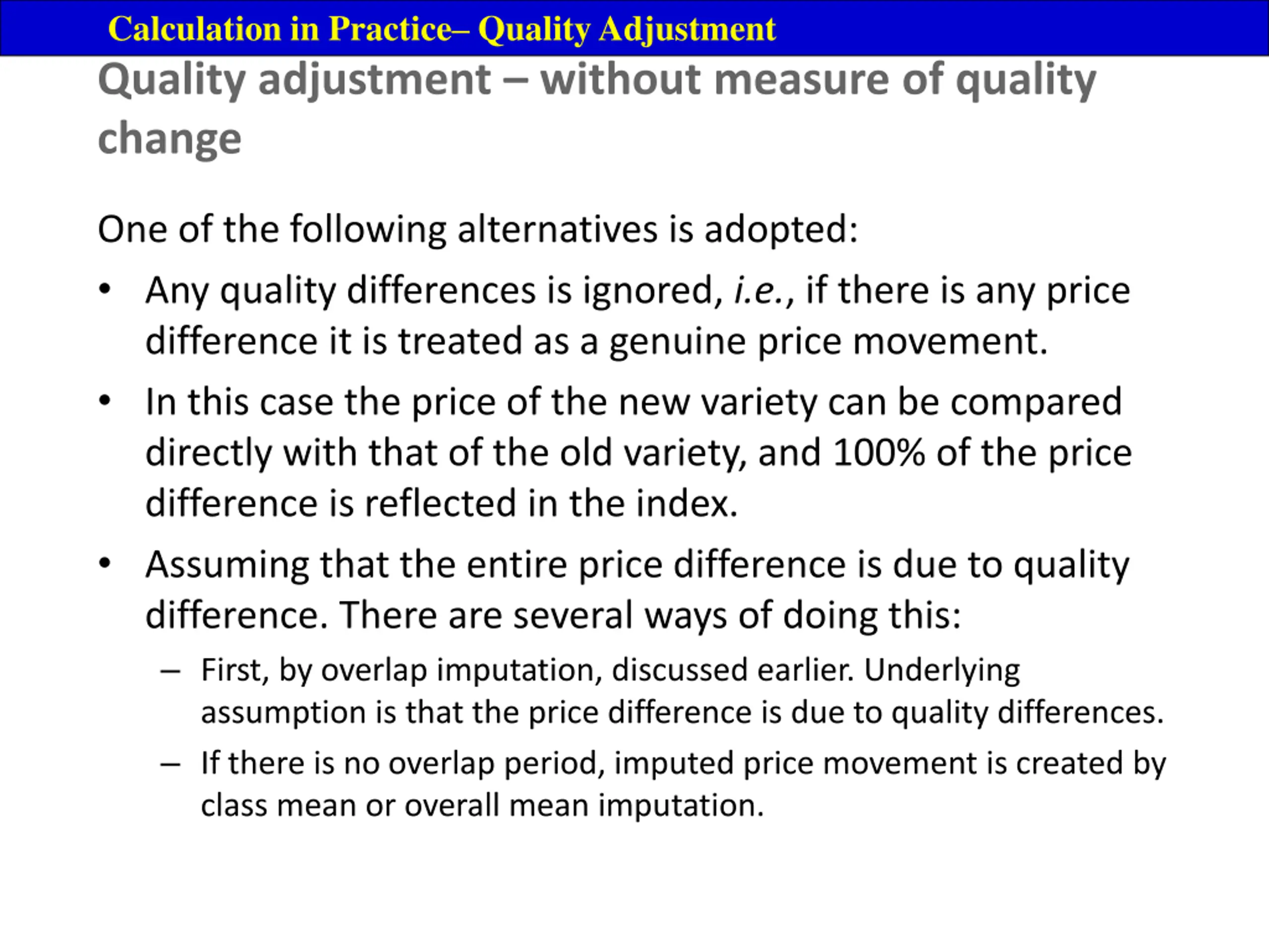 Calculation in Practice Quality Adjustment Quality adjustment without measure of quality change One of the following alternatives is adopted: Any quality differences is ignored, i.e., if there is any price difference it is treated as a genuine price movement. In this case the price of the new variety can be compared directly with that of the old variety, and 100% of the price difference is reflected in the index. Assuming that the entire price difference is due to quality difference. There are several ways of doing this: First, by overlap imputation, discussed earlier. Underlying assumption is that the price difference is due to quality differences. If there is no overlap period, imputed price movement is created by class mean or overall mean imputation.