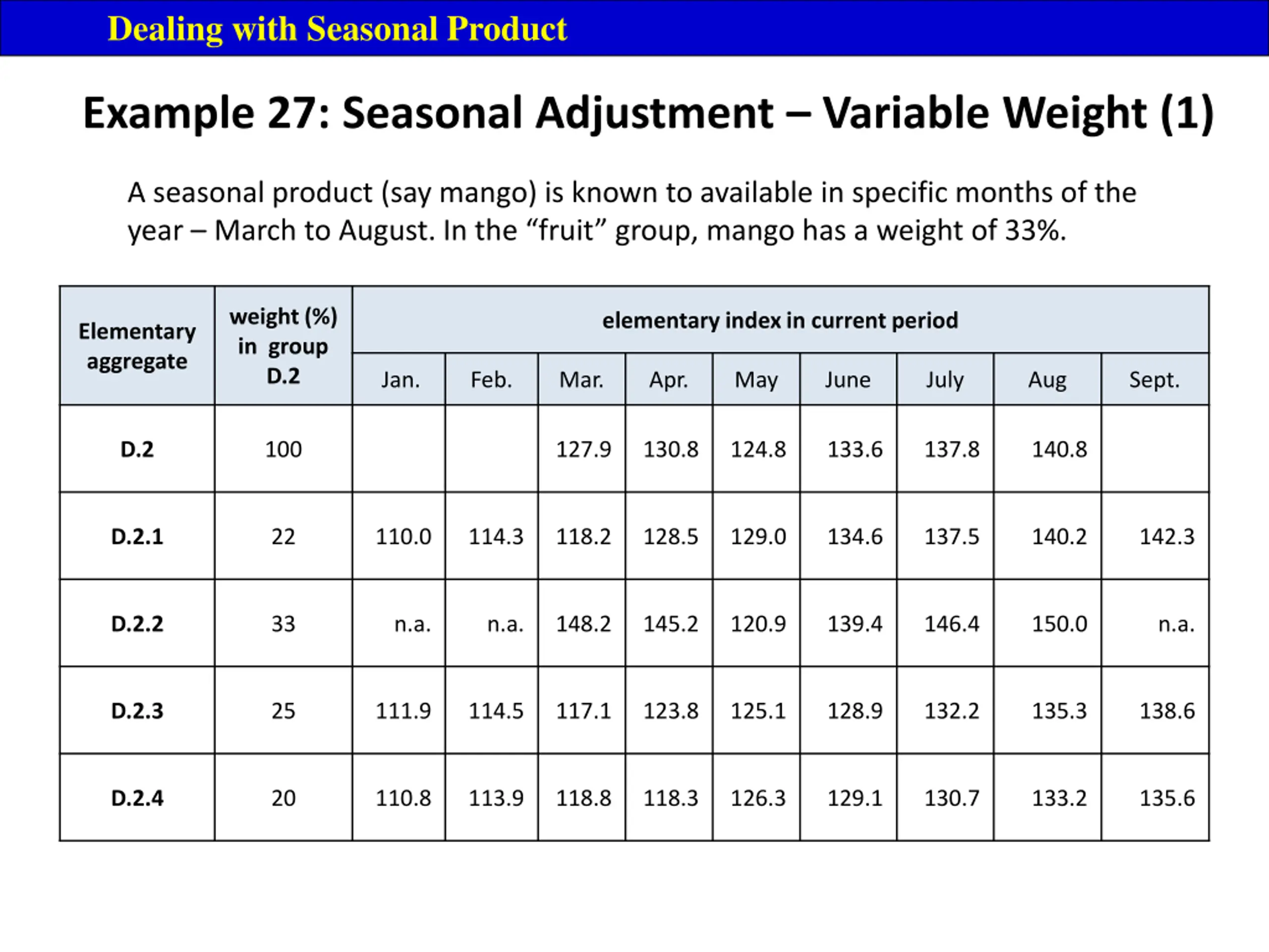 Dealing with Seasonal Product Example 27: Seasonal Adjustment Variable Weight (1) A seasonal product (say mango) is known to available in specific months of the year March to August. In the fruit group, mango has a weight of 33%. weight (%) in group D.2 elementary index in current period Elementary aggregate Jan. Feb. Mar. Apr. May June July Aug Sept. D.2 100 127.9 130.8 124.8 133.6 137.8 140.8 D.2.1 22 110.0 114.3 118.2 128.5 129.0 134.6 137.5 140.2 142.3 D.2.2 33 n.a. n.a. 148.2 145.2 120.9 139.4 146.4 150.0 n.a. D.2.3 25 111.9 114.5 117.1 123.8 125.1 128.9 132.2 135.3 138.6 D.2.4 20 110.8 113.9 118.8 118.3 126.3 129.1 130.7 133.2 135.6