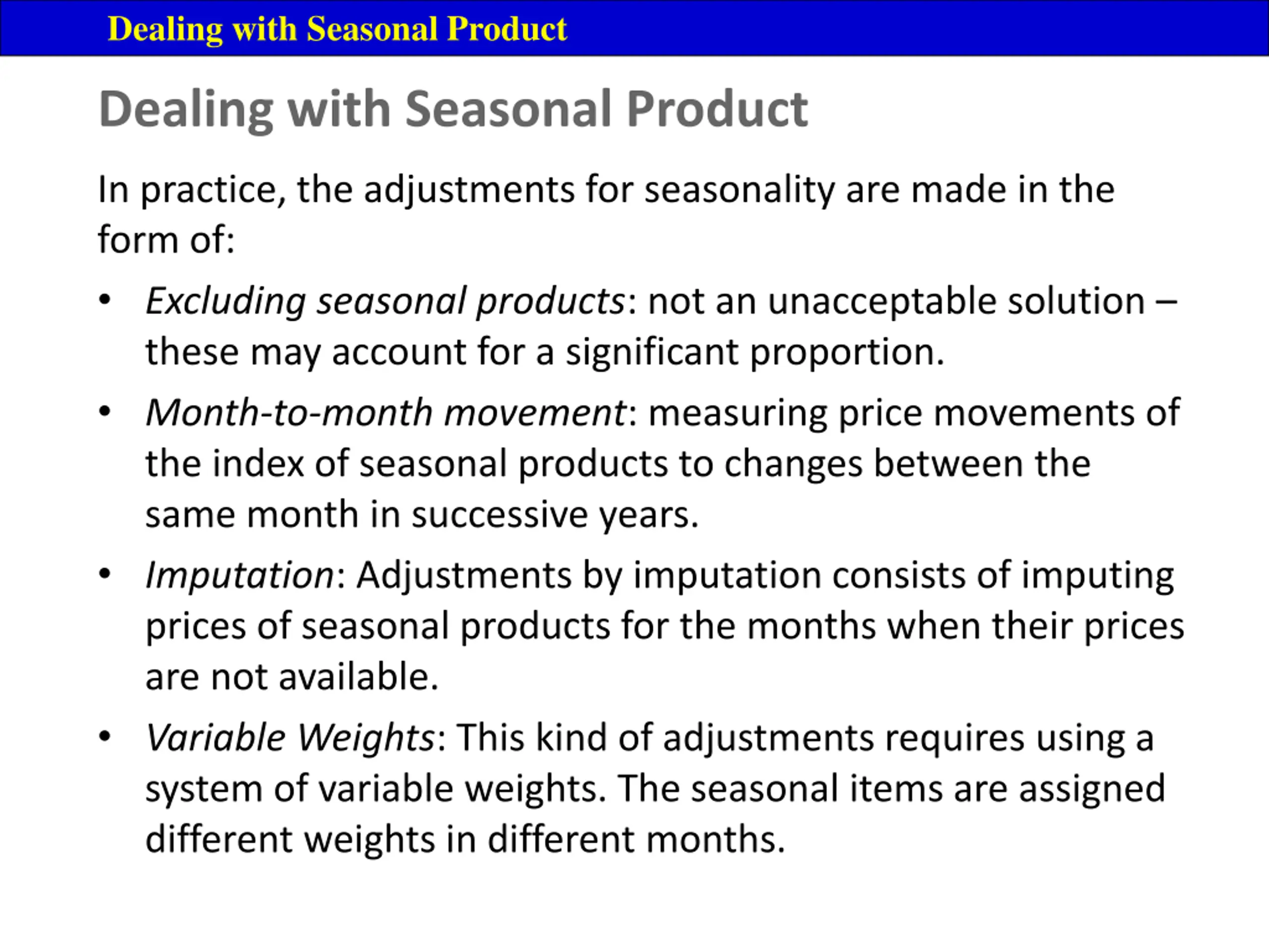 Dealing with Seasonal Product Dealing with Seasonal Product In practice, the adjustments for seasonality are made in the form of: Excludingseasonal products: not an unacceptable solution these may account for a significant proportion. Month-to-month movement: measuring price movements of the index of seasonal products to changes between the same month in successive years. Imputation: Adjustments by imputation consists of imputing prices of seasonal products for the months when their prices are not available. Variable Weights: This kind of adjustments requires using a system of variable weights. The seasonal items are assigned different weights in different months.