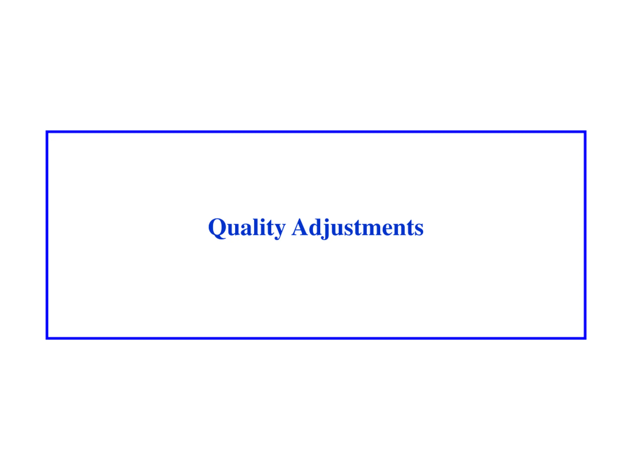 Calculation in Practice Quality Adjustment Quality adjustment When an old product is replaced by a new product of different quality, it is essential to make a quality adjustment. A quality adjustment of the replacement item s price is to multiply the new product s price by a coefficient ( ). (1 / ) represents the part of the price change owing to quality difference between the replaced and replacement items. In practice, an estimate of the coefficient is obtained from data available.