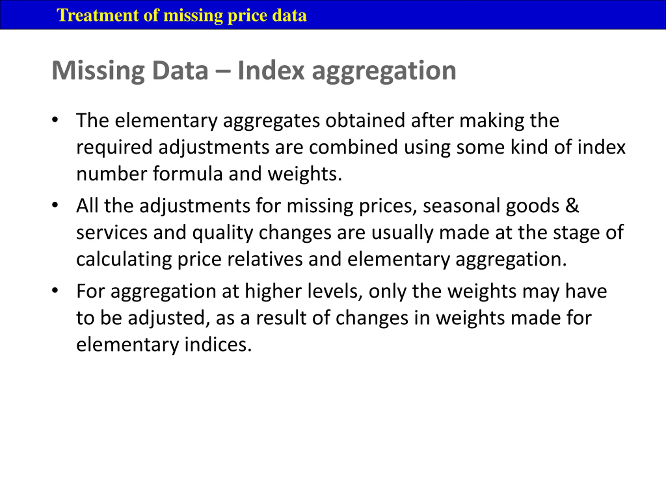 Treatment of missing price data Missing Data Index aggregation The elementary aggregates obtained after making the required adjustments are combined using some kind of index number formula and weights. All the adjustments for missing prices, seasonal goods & services and quality changes are usually made at the stage of calculating price relatives and elementary aggregation. For aggregation at higher levels, only the weights may have to be adjusted, as a result of changes in weights made for elementary indices.