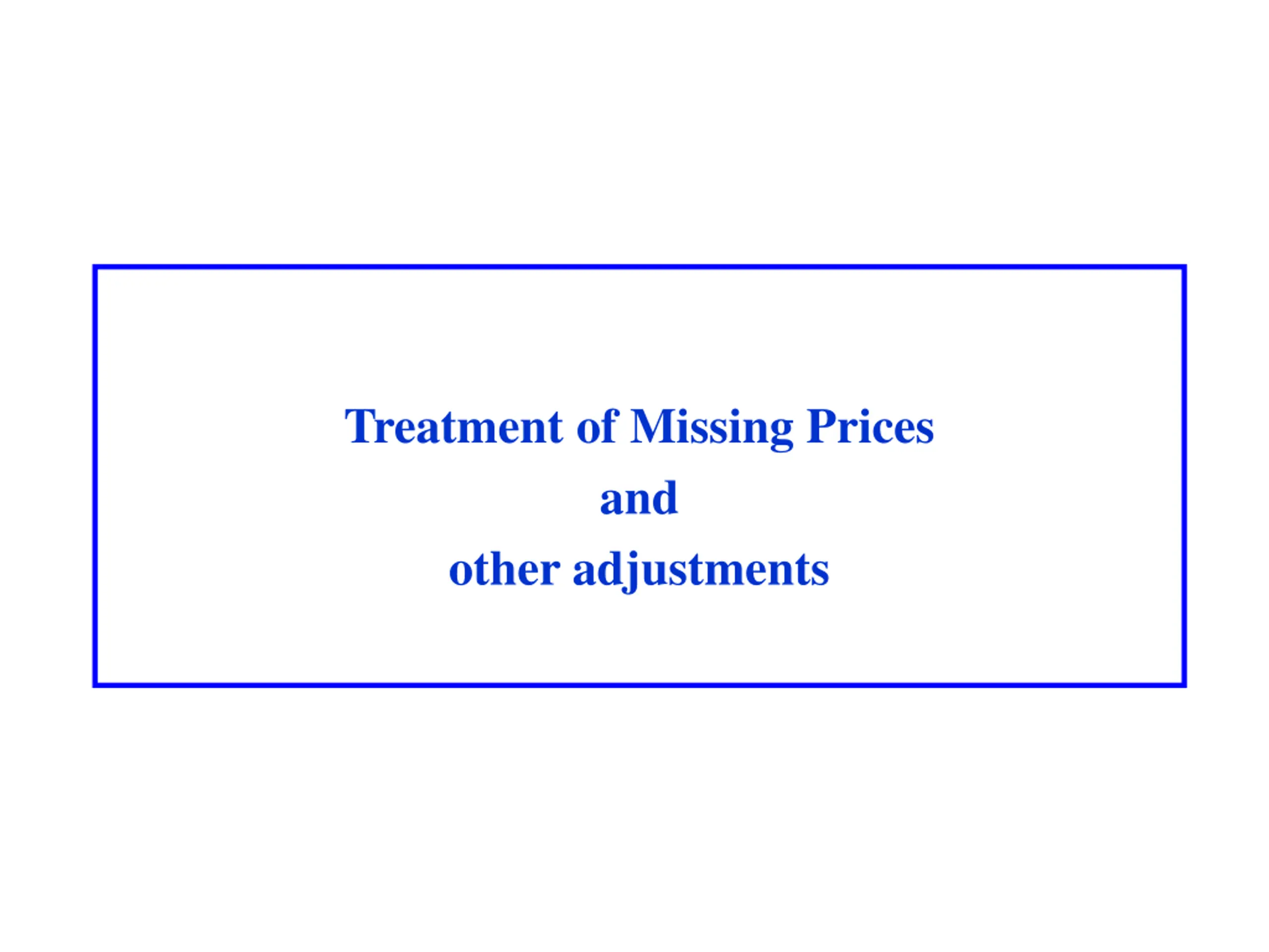 Treatment of missing price data Calculating Elementary Price Index Issues involved: Weights within elementary index: Usually, calculated as averages with no explicit weights, but sometimes requires implicit weights introduced by the sampling selection procedure. Missing price observations Seasonal items Quality adjustment