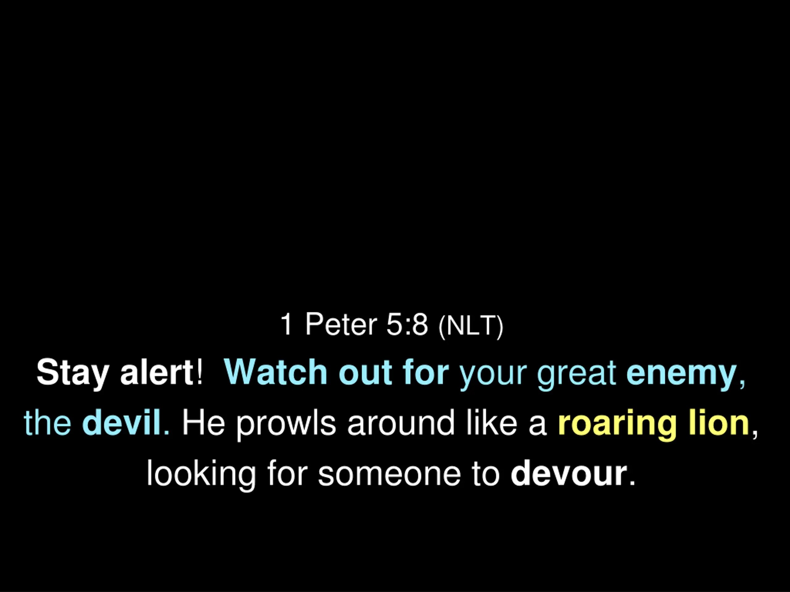 1 Peter 5:8 (NLT) Stay alert! Watch out for your great enemy, the devil. He prowls around like a roaring lion, looking for someone to devour.