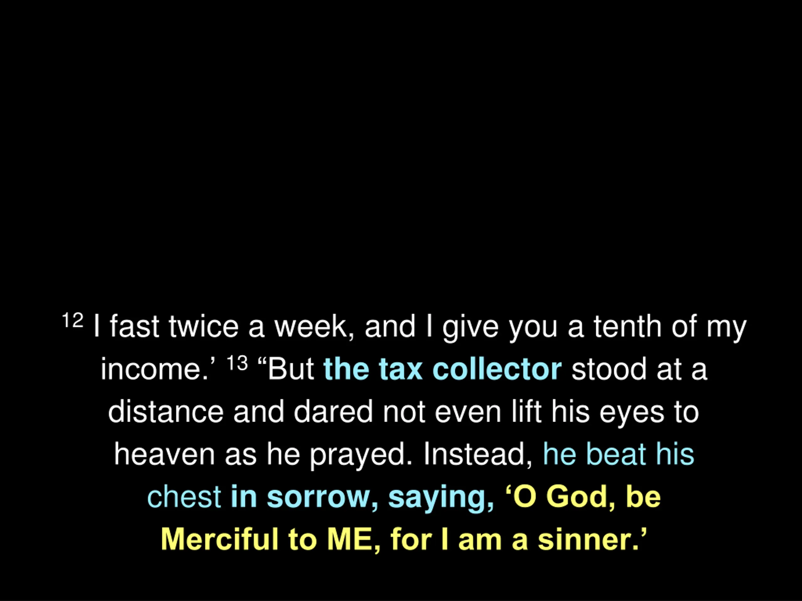 12I fast twice a week, and I give you a tenth of my income. 13 But the tax collector stood at a distance and dared not even lift his eyes to heaven as he prayed. Instead, he beat his chest in sorrow, saying, O God, be Merciful to ME, for I am a sinner.