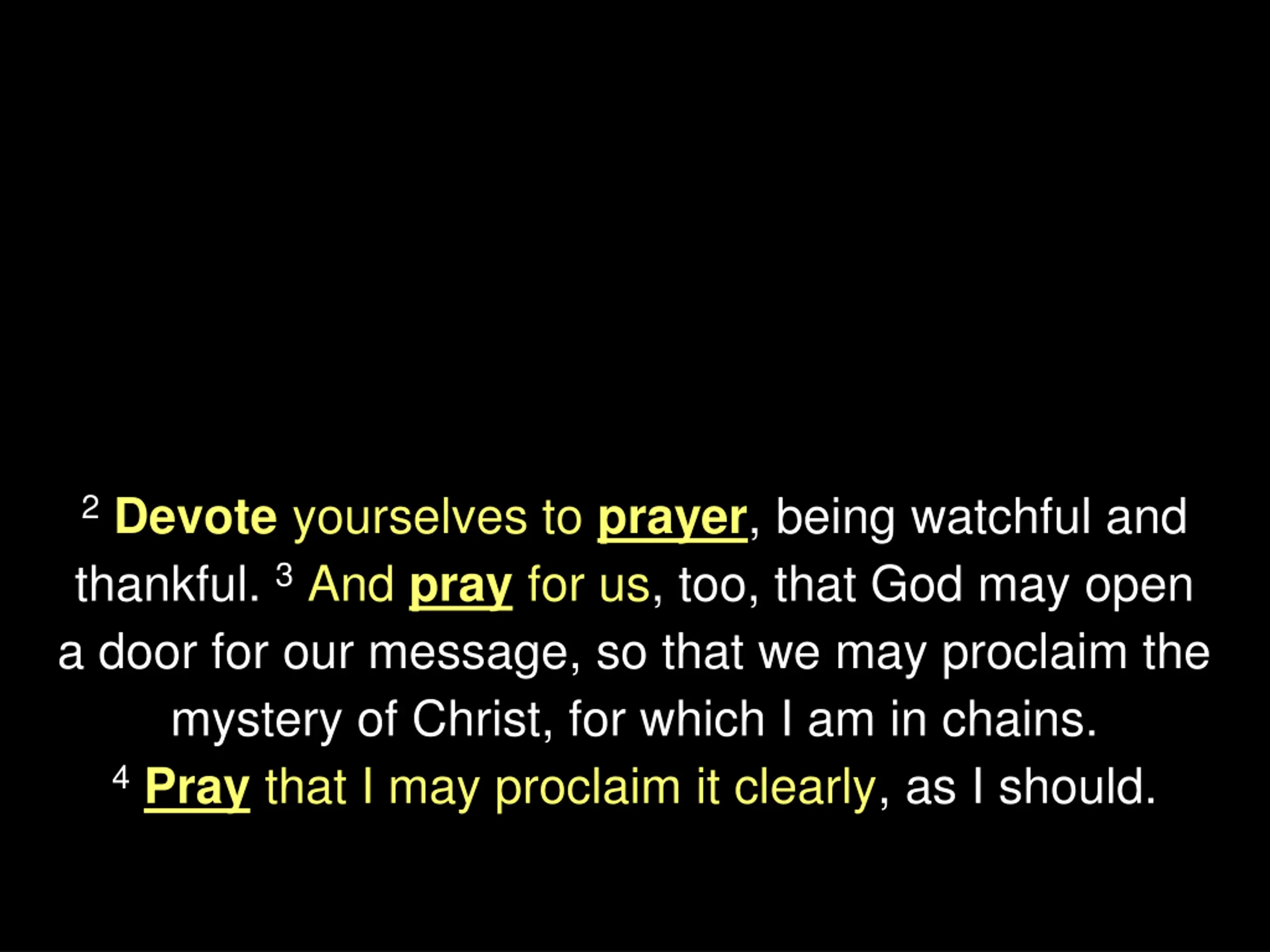 2Devote yourselves to prayer, being watchful and thankful. 3And pray for us, too, that God may open a door for our message, so that we may proclaim the mystery of Christ, for which I am in chains. 4Pray that I may proclaim it clearly, as I should.