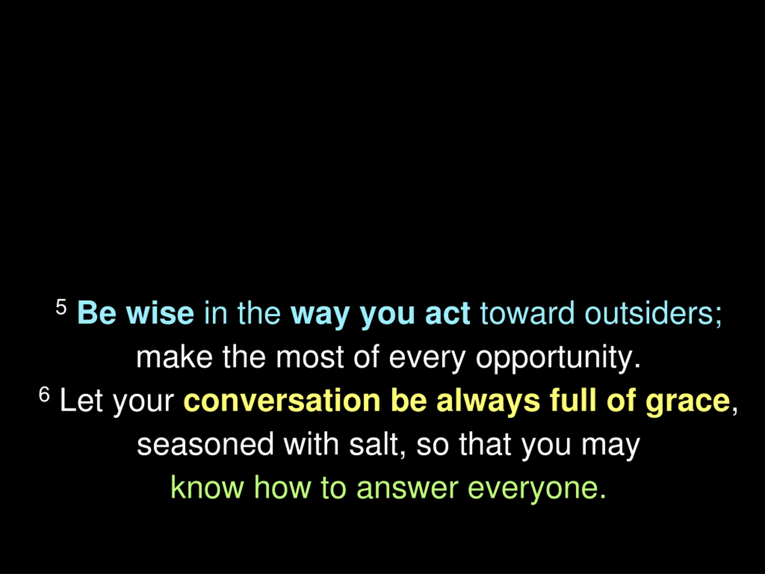 5Be wise in the way you act toward outsiders; make the most of every opportunity. 6Let your conversation be always full of grace, seasoned with salt, so that you may know how to answer everyone.