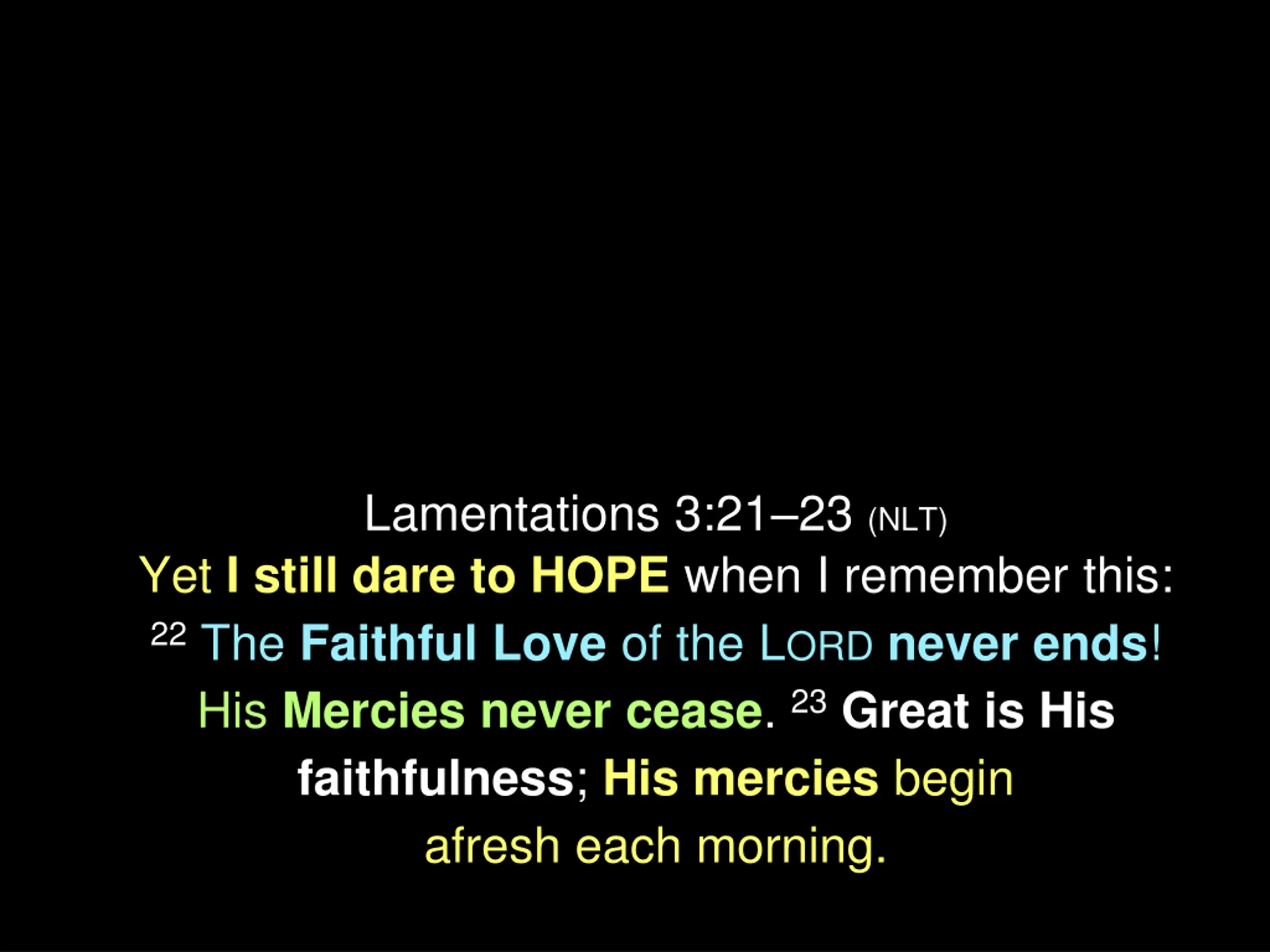 Lamentations 3:2123 (NLT) Yet I still dare to HOPE when I remember this: 22The Faithful Love of the LORD never ends! His Mercies never cease. 23Great is His faithfulness; His mercies begin afresh each morning.