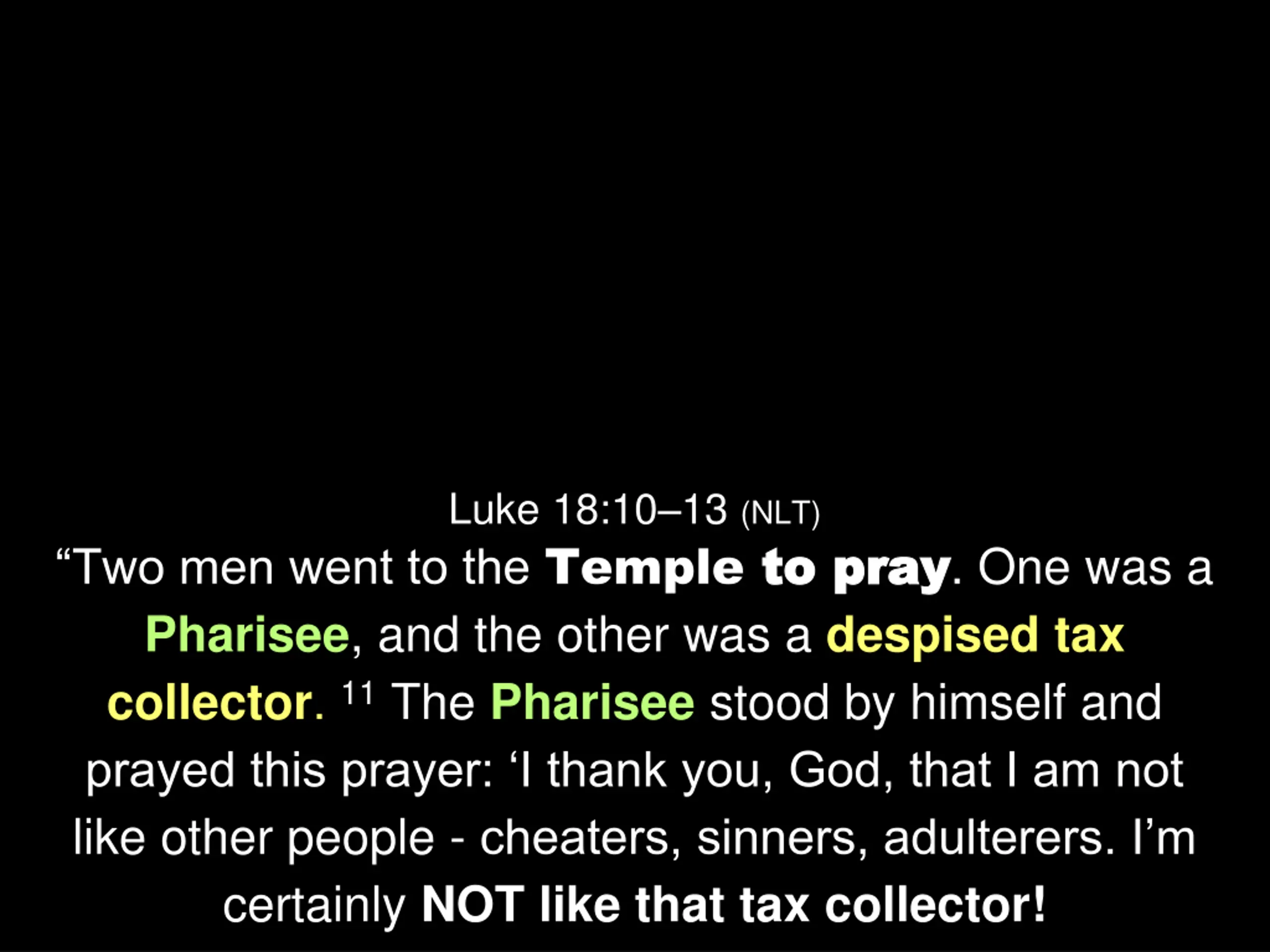 Luke 18:1013 (NLT) Two men went to the Temple to pray Pharisee, and the other was a despised tax collector.11The Pharisee stood by himself and prayed this prayer: I thank you, God, that I am not like other people - cheaters, sinners, adulterers. I m certainly NOT like that tax collector! to pray. One was a