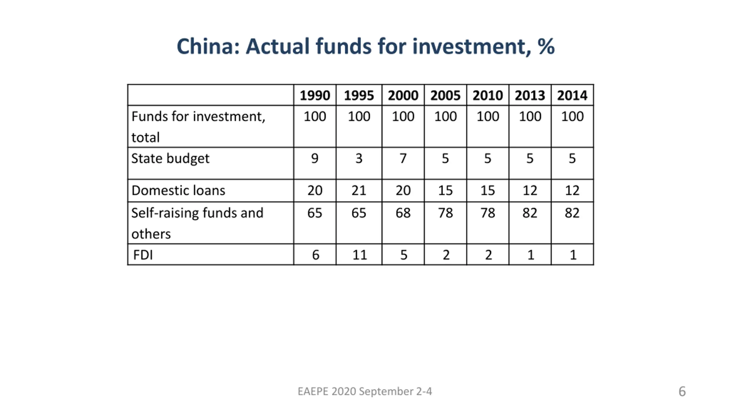 China: Actual funds for investment, % 1990 1995 2000 2005 2010 2013 2014 100 100 100 100 Funds for investment, total State budget 100 100 100 9 3 7 5 5 5 5 Domestic loans Self-raising funds and others FDI 20 65 21 65 20 68 15 78 15 78 12 82 12 82 6 11 5 2 2 1 1 6 EAEPE 2020 September 2-4