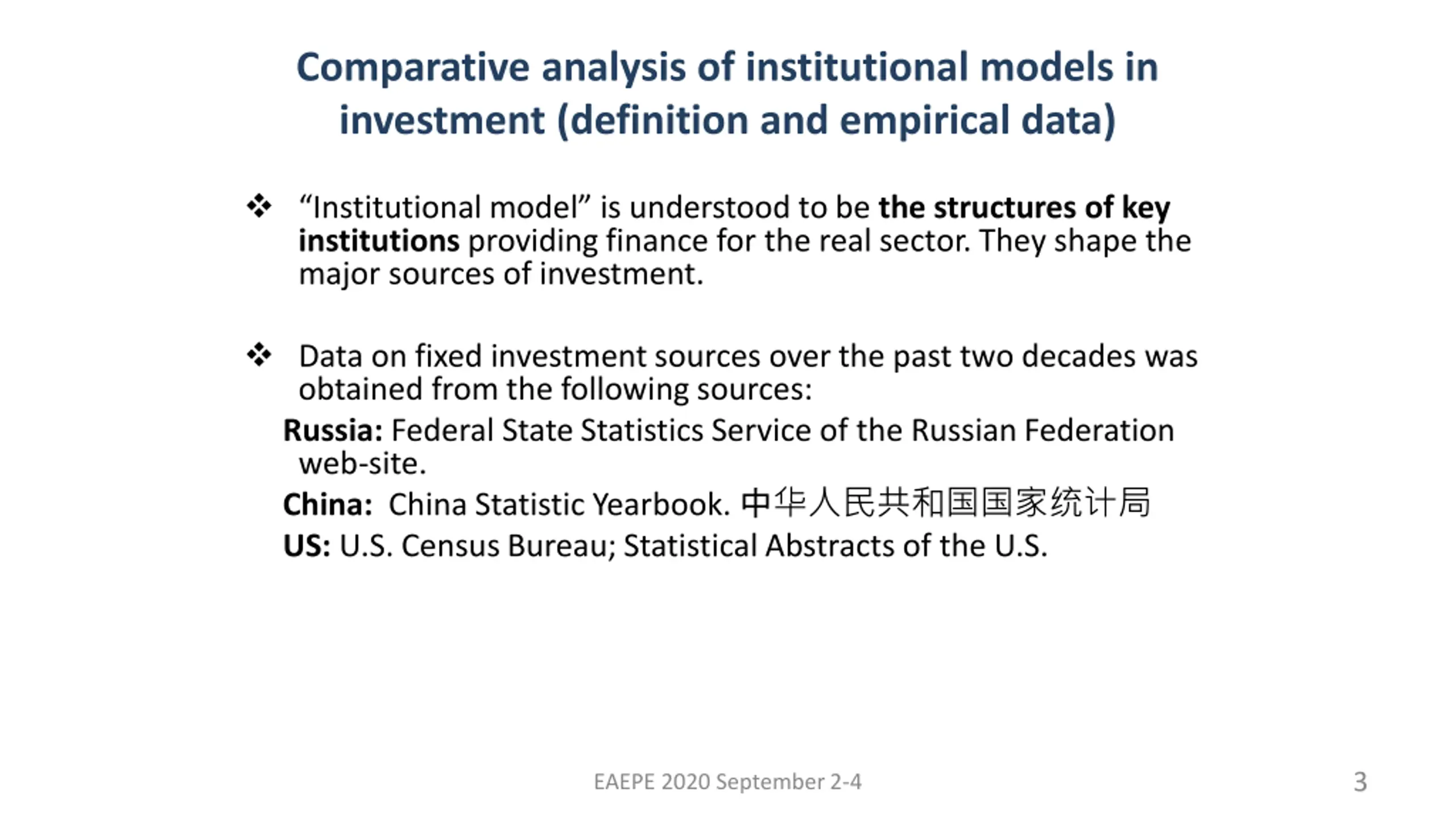 Comparative analysis of institutional models in investment (definition and empirical data) Institutional model is understood to be the structures of key institutions providing finance for the real sector. They shape the major sources of investment. Data on fixed investment sources over the past two decades was obtained from the following sources: Russia: Federal State Statistics Service of the Russian Federation web-site. China: China Statistic Yearbook. US: U.S. Census Bureau; Statistical Abstracts of the U.S. 3 EAEPE 2020 September 2-4