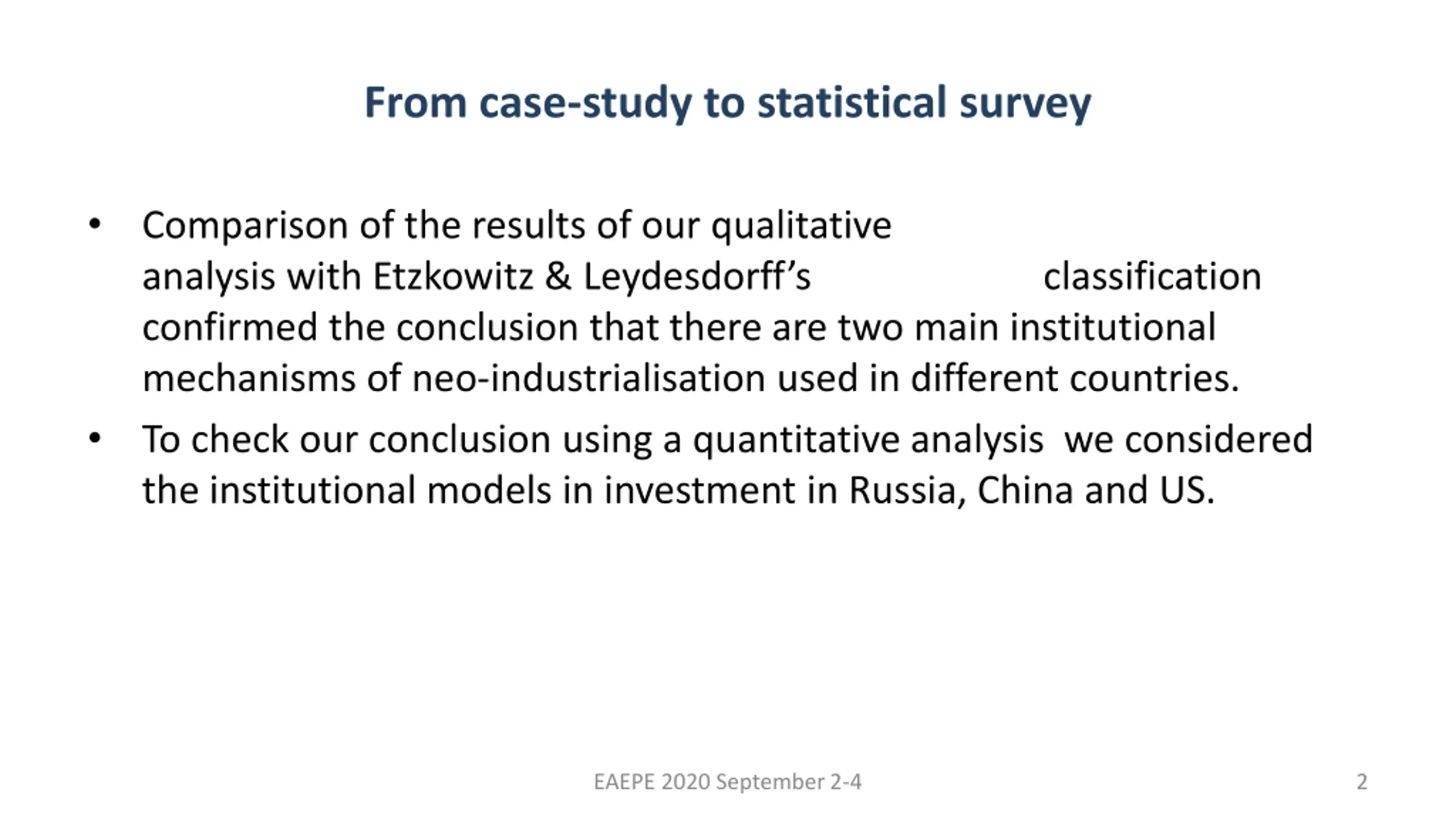 From case-study to statistical survey Comparison of the results of our qualitative analysis with Etzkowitz & Leydesdorff s confirmed the conclusion that there are two main institutional mechanisms of neo-industrialisation used in different countries. To check our conclusion using a quantitative analysis we considered the institutional models in investment in Russia, China and US. classification EAEPE 2020 September 2-4 2