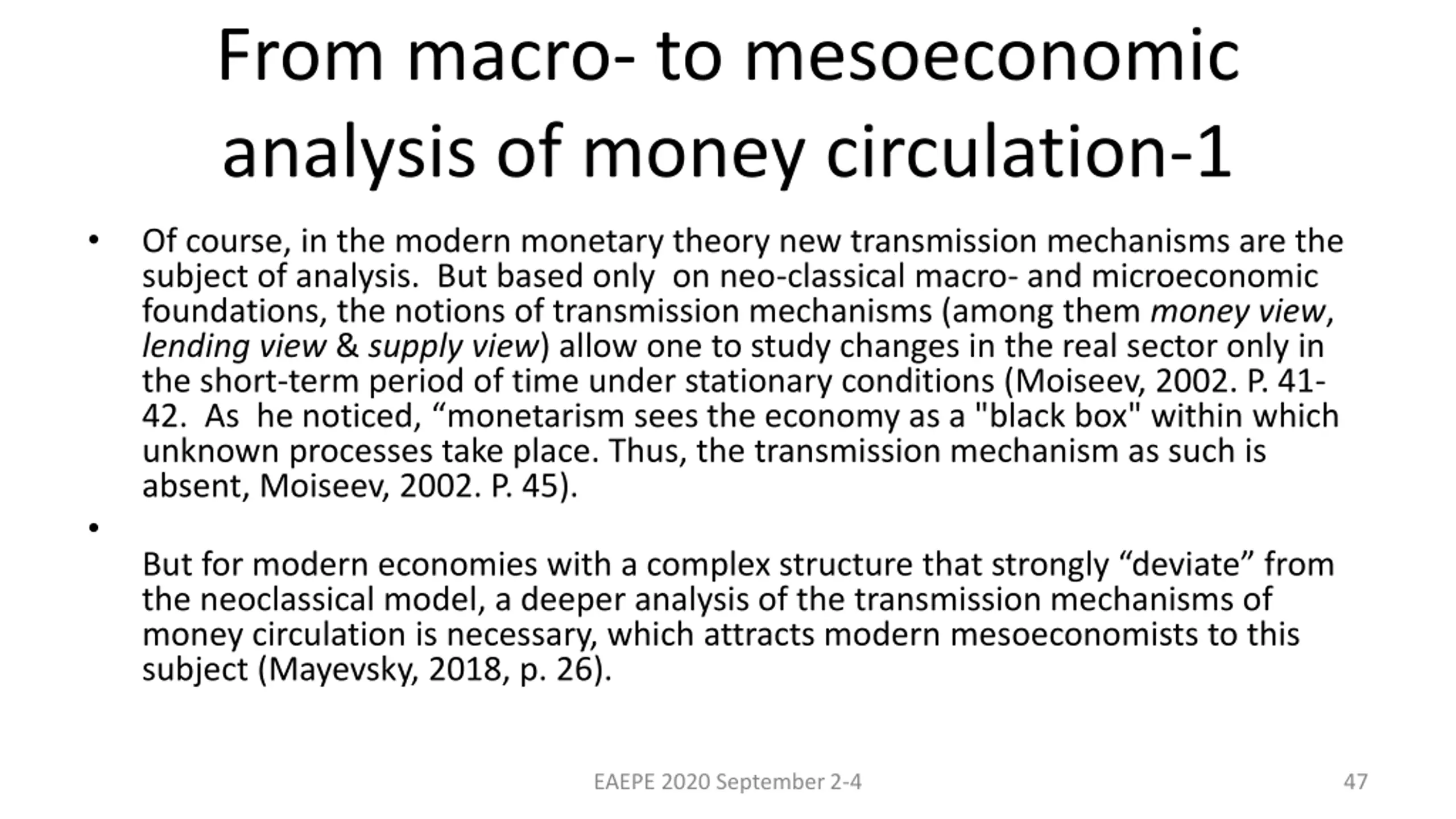 From macro- to mesoeconomic analysis of money circulation-1 Of course, in the modern monetary theory new transmission mechanisms are the subject of analysis. But based only on neo-classical macro- and microeconomic foundations, the notions of transmission mechanisms (among them money view, lending view & supply view) allow one to study changes in the real sector only in the short-term period of time under stationary conditions (Moiseev, 2002. P. 41- 42. As he noticed, monetarism sees the economy as a "black box" within which unknown processes take place. Thus, the transmission mechanism as such is absent, Moiseev, 2002. P. 45). But for modern economies with a complex structure that strongly deviate from the neoclassical model, a deeper analysis of the transmission mechanisms of money circulation is necessary, which attracts modern mesoeconomists to this subject (Mayevsky, 2018, p. 26). EAEPE 2020 September 2-4 47