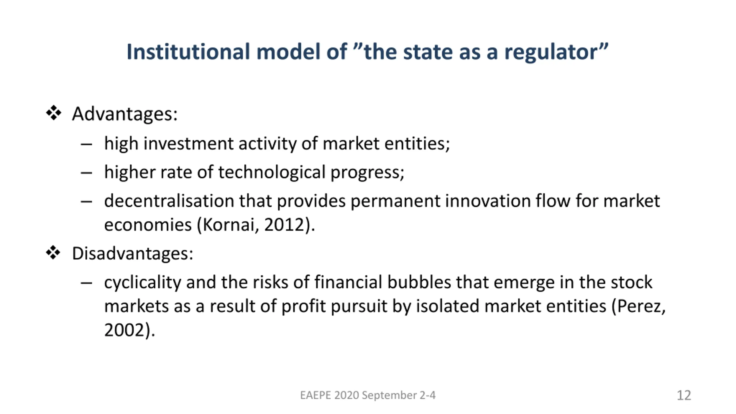Institutional model of the state as a regulator Advantages: high investment activity of market entities; higher rate of technological progress; decentralisation that provides permanent innovation flow for market economies (Kornai, 2012). Disadvantages: cyclicality and the risks of financial bubbles that emerge in the stock markets as a result of profit pursuit by isolated market entities (Perez, 2002). 12 EAEPE 2020 September 2-4