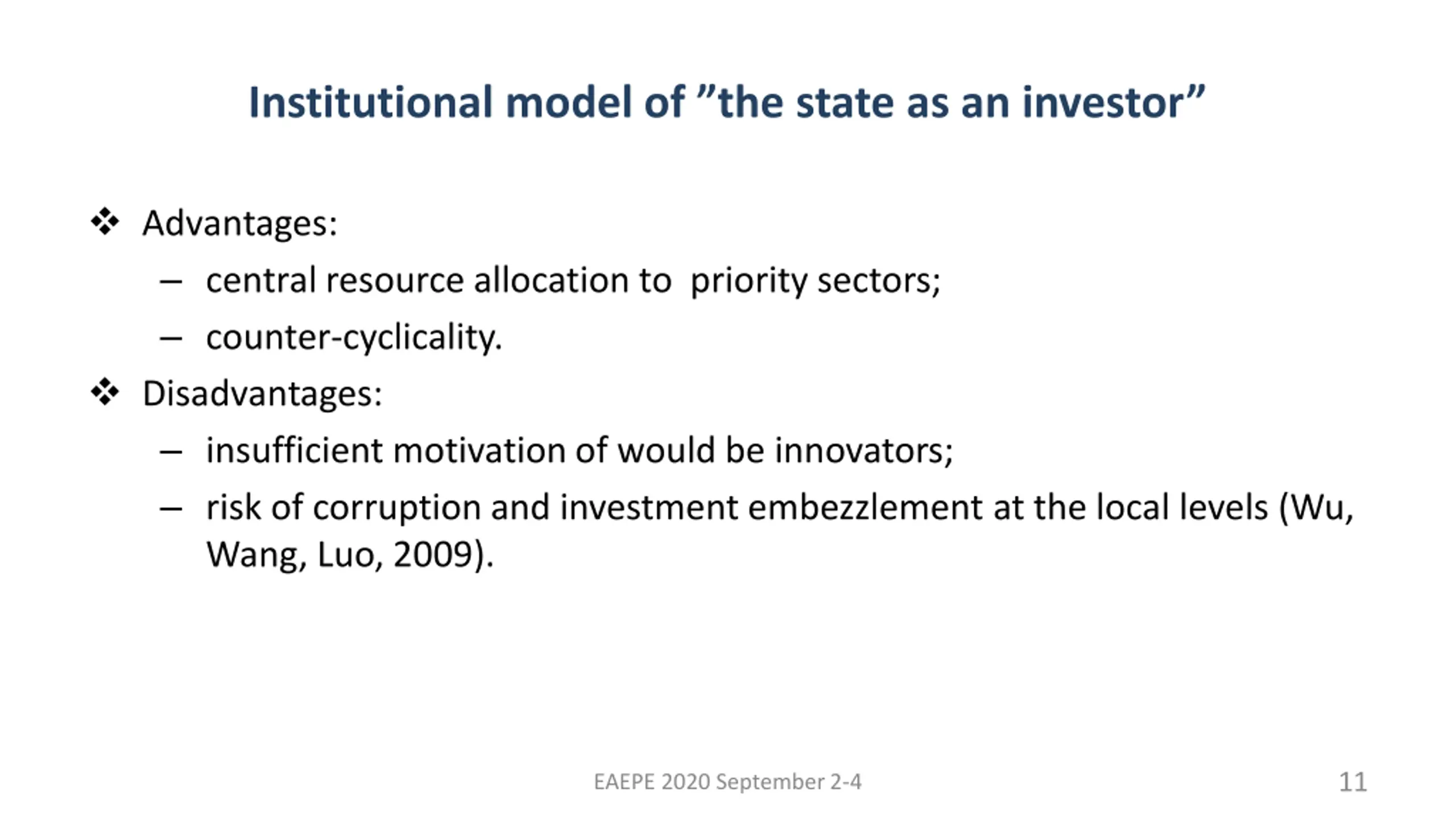 Institutional model of the state as an investor Advantages: central resource allocation to priority sectors; counter-cyclicality. Disadvantages: insufficient motivation of would be innovators; risk of corruption and investment embezzlement at the local levels (Wu, Wang, Luo, 2009). 11 EAEPE 2020 September 2-4