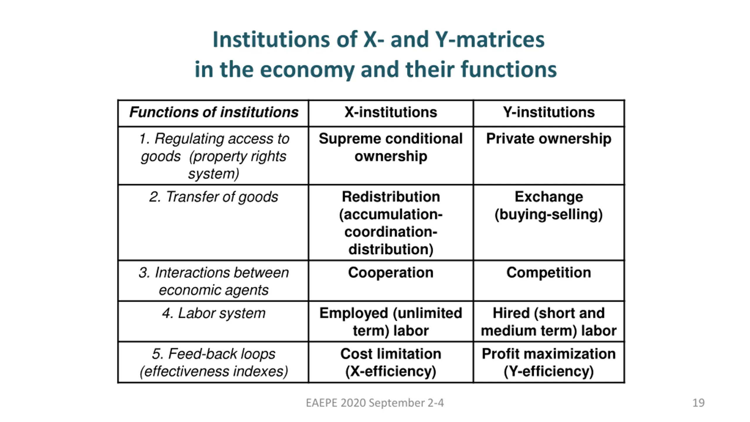Institutions of X- and Y-matrices in the economy and their functions Functions of institutions X-institutions Y-institutions 1. Regulating access to goods (property rights system) 2. Transfer of goods Supreme conditional ownership Private ownership Redistribution (accumulation- coordination- distribution) Cooperation Exchange (buying-selling) 3. Interactions between economic agents 4. Labor system Competition Employed (unlimited term) labor Cost limitation ( -efficiency) Hired (short and medium term) labor Profit maximization (Y-efficiency) 5. Feed-back loops (effectiveness indexes) EAEPE 2020 September 2-4 19