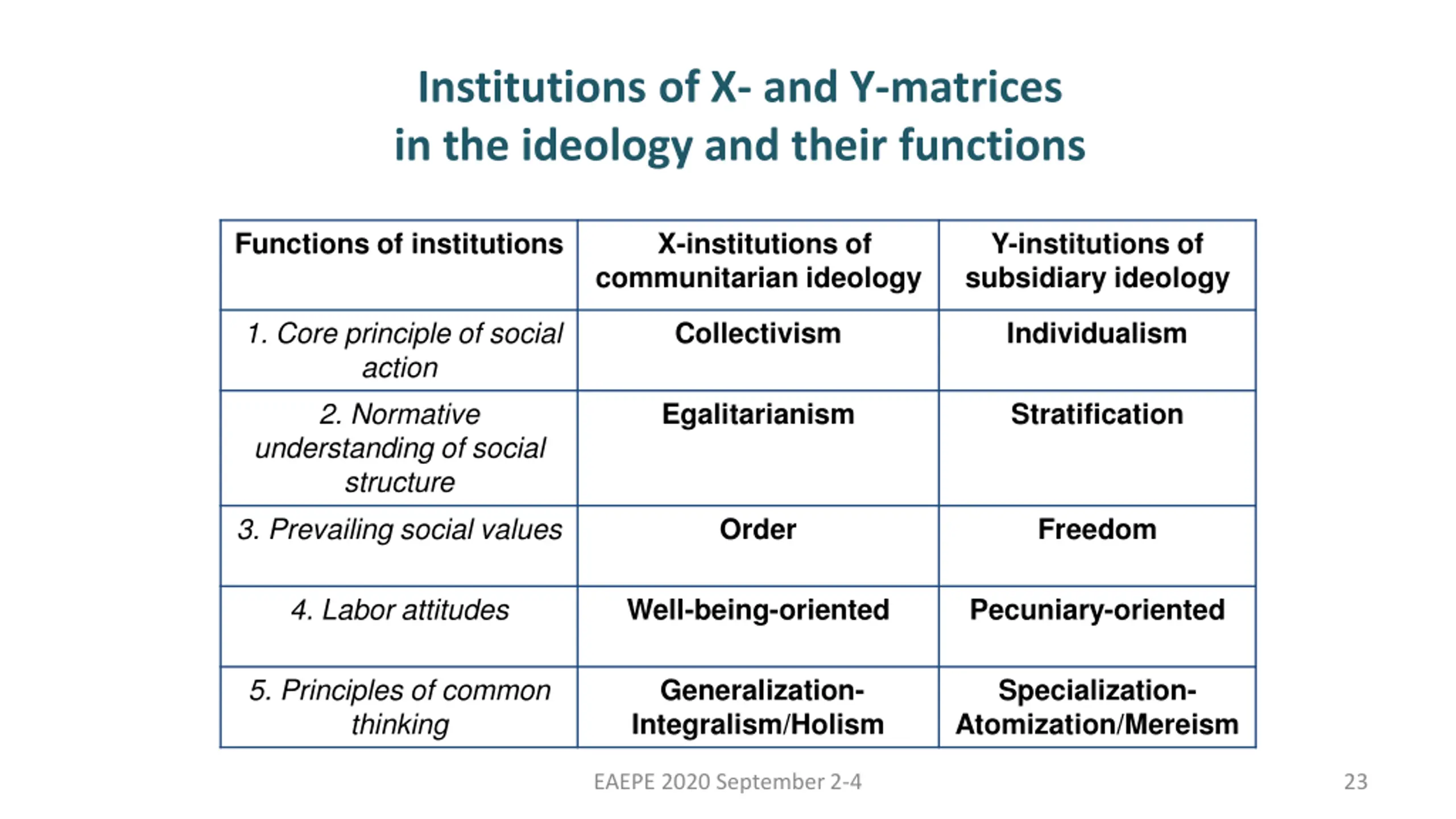 Institutions of X- and Y-matrices in the ideology and their functions Functions of institutions X-institutions of communitarian ideology Y-institutions of subsidiary ideology 1. Core principle of social action 2. Normative understanding of social structure 3. Prevailing social values Collectivism Individualism Egalitarianism Stratification Order Freedom 4. Labor attitudes Well-being-oriented Pecuniary-oriented 5. Principles of common thinking Generalization- Integralism/Holism Specialization- Atomization/Mereism EAEPE 2020 September 2-4 23