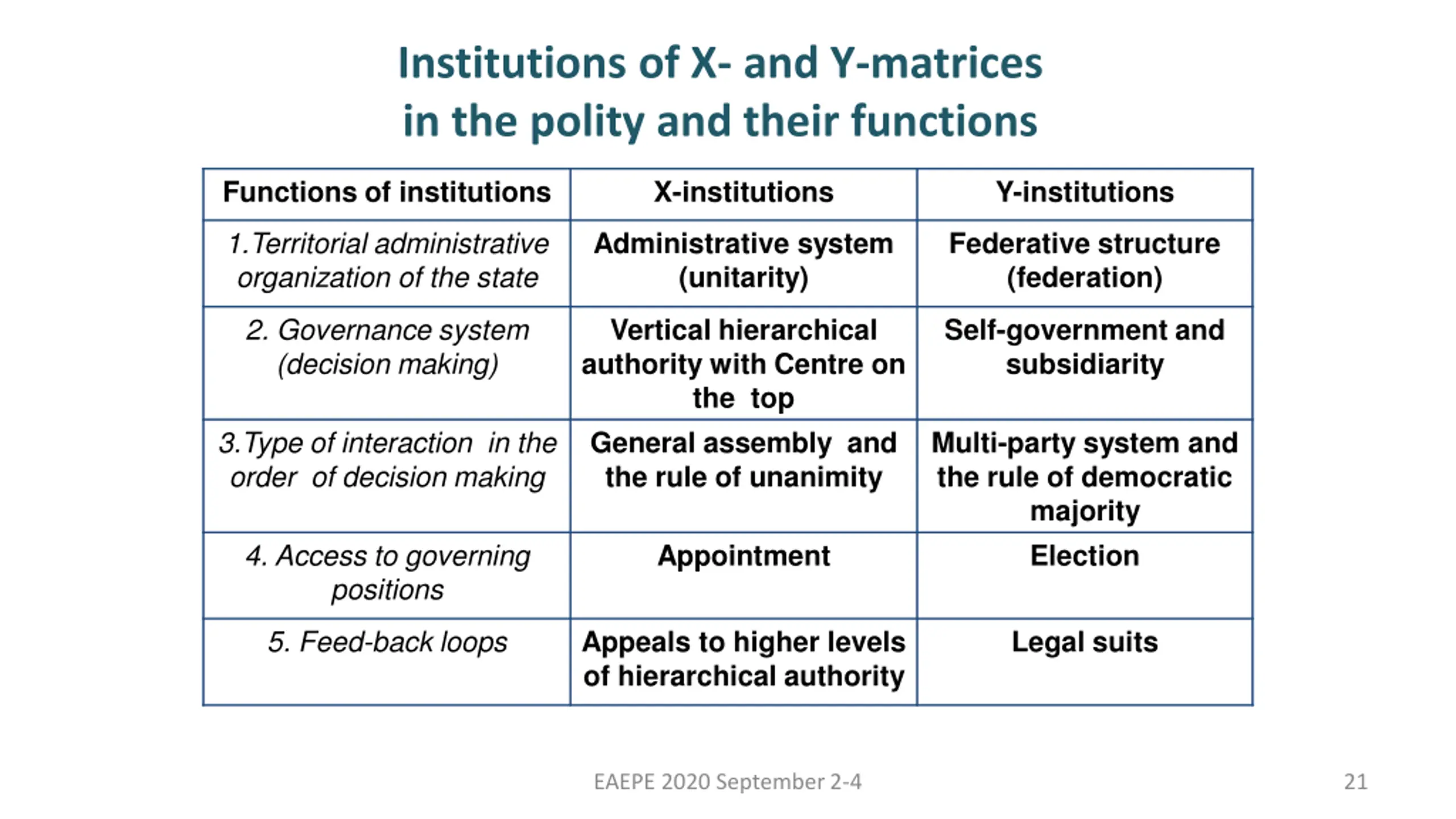 Institutions of X- and Y-matrices in the polity and their functions Functions of institutions X-institutions Y-institutions 1.Territorial administrative organization of the state Administrative system (unitarity) Federative structure (federation) 2. Governance system (decision making) Vertical hierarchical authority with Centre on the top General assembly and the rule of unanimity Self-government and subsidiarity 3.Type of interaction in the order of decision making Multi-party system and the rule of democratic majority Election 4. Access to governing positions Appointment 5. Feed-back loops Appeals to higher levels of hierarchical authority Legal suits EAEPE 2020 September 2-4 21