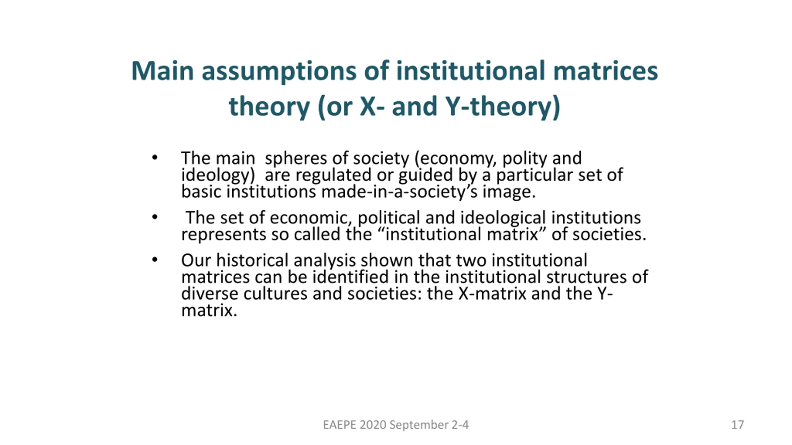 Main assumptions of institutional matrices theory (or X- and Y-theory) The main spheres of society (economy, polity and ideology) are regulated or guided by a particular set of basic institutions made-in-a-society s image. The set of economic, political and ideological institutions represents so called the institutional matrix of societies. Our historical analysis shown that two institutional matrices can be identified in the institutional structures of diverse cultures and societies: the X-matrix and the Y- matrix. EAEPE 2020 September 2-4 17