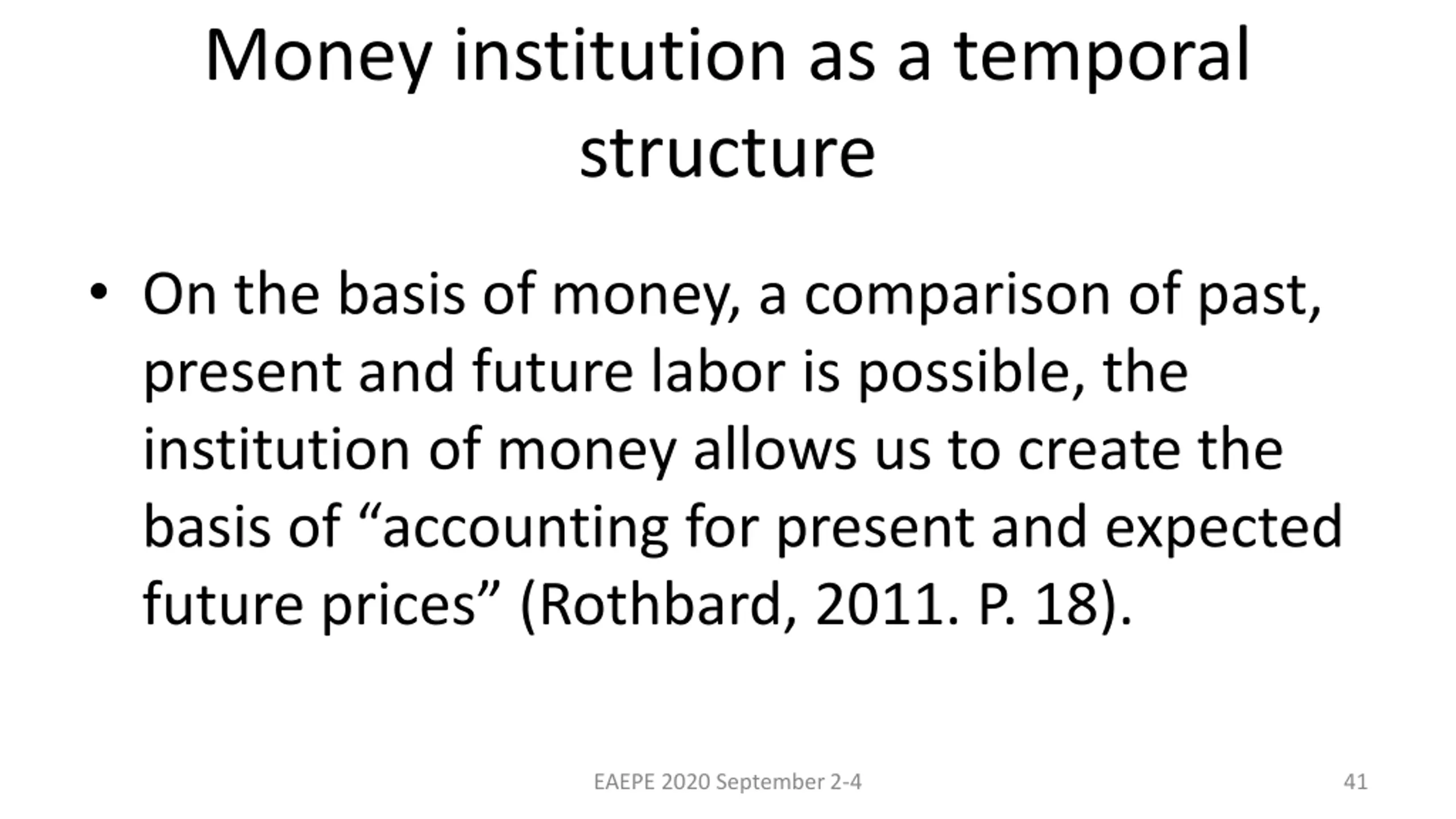 Money institution as a temporal structure On the basis of money, a comparison of past, present and future labor is possible, the institution of money allows us to create the basis of accounting for present and expected future prices (Rothbard, 2011. P. 18). EAEPE 2020 September 2-4 41