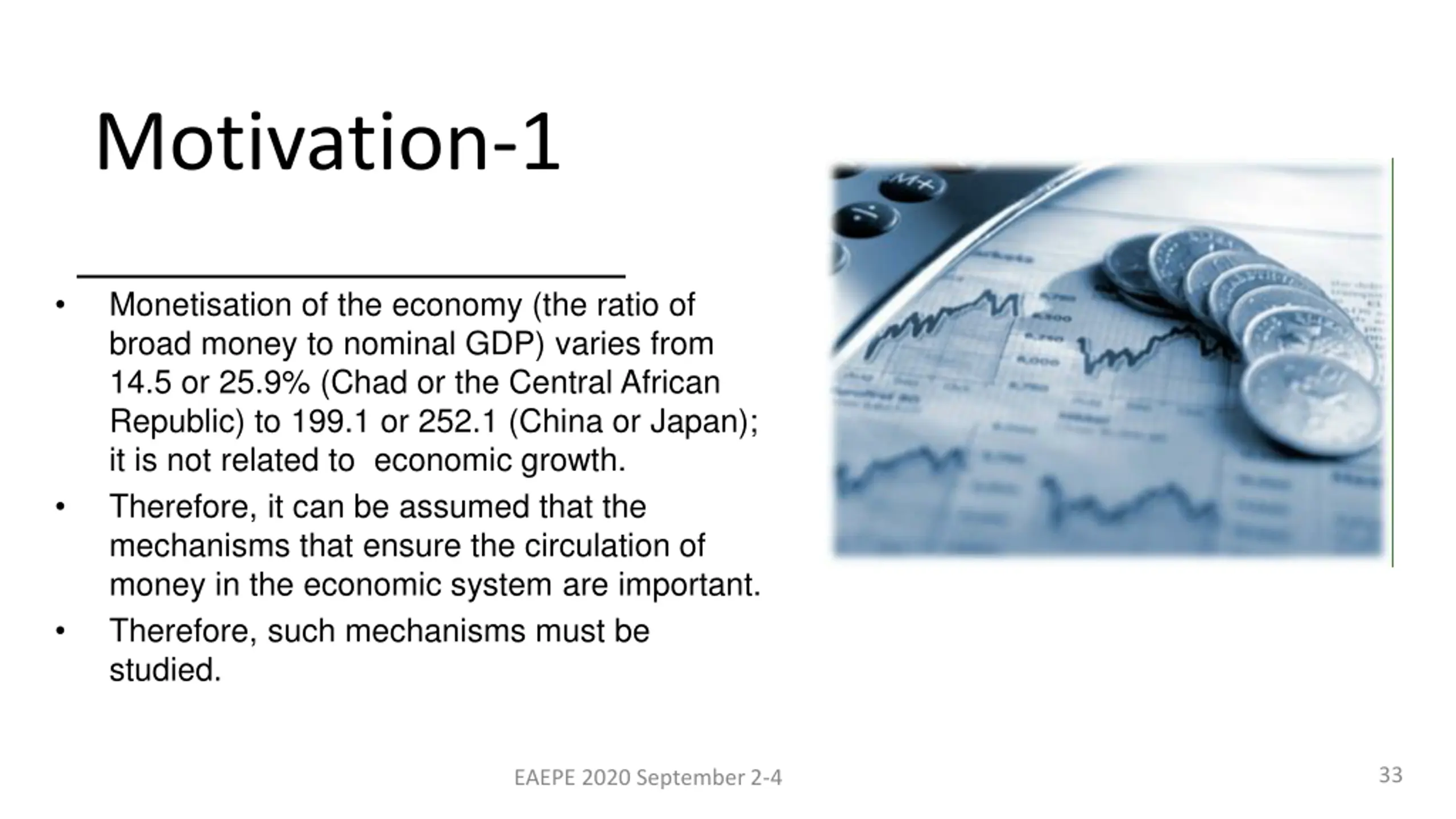 Motivation-1 Monetisation of the economy (the ratio of broad money to nominal GDP) varies from 14.5 or 25.9% (Chad or the Central African Republic) to 199.1 or 252.1 (China or Japan); it is not related to economic growth. Therefore, it can be assumed that the mechanisms that ensure the circulation of money in the economic system are important. Therefore, such mechanisms must be studied. 33 EAEPE 2020 September 2-4