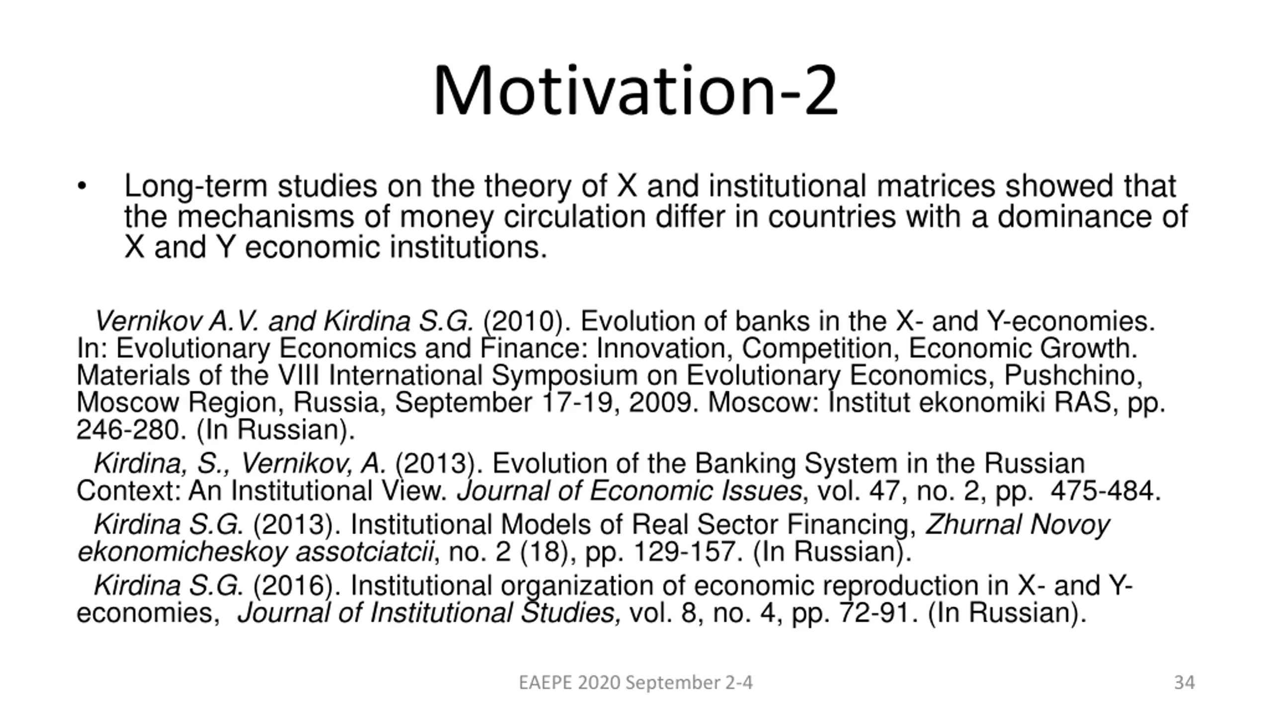 Motivation-2 Long-term studies on the theory of X and institutional matrices showed that the mechanisms of money circulation differ in countries with a dominance of X and Y economic institutions. Vernikov A.V. and Kirdina S.G. (2010). Evolution of banks in the X- and Y-economies. In: Evolutionary Economics and Finance: Innovation, Competition, Economic Growth. Materials of the VIII International Symposium on Evolutionary Economics, Pushchino, Moscow Region, Russia, September 17-19, 2009. Moscow: Institut ekonomiki RAS, pp. 246-280. (In Russian). Kirdina, S., Vernikov, A. (2013). Evolution of the Banking System in the Russian Context: An Institutional View. Journal of Economic Issues, vol. 47, no. 2, pp. 475-484. Kirdina S.G. (2013). Institutional Models of Real Sector Financing, Zhurnal Novoy ekonomicheskoy assotciatcii, no. 2 (18), pp. 129-157. (In Russian). Kirdina S.G. (2016). Institutional organization of economic reproduction in X- and Y- economies, Journal of Institutional Studies, vol. 8, no. 4, pp. 72-91. (In Russian). EAEPE 2020 September 2-4 34