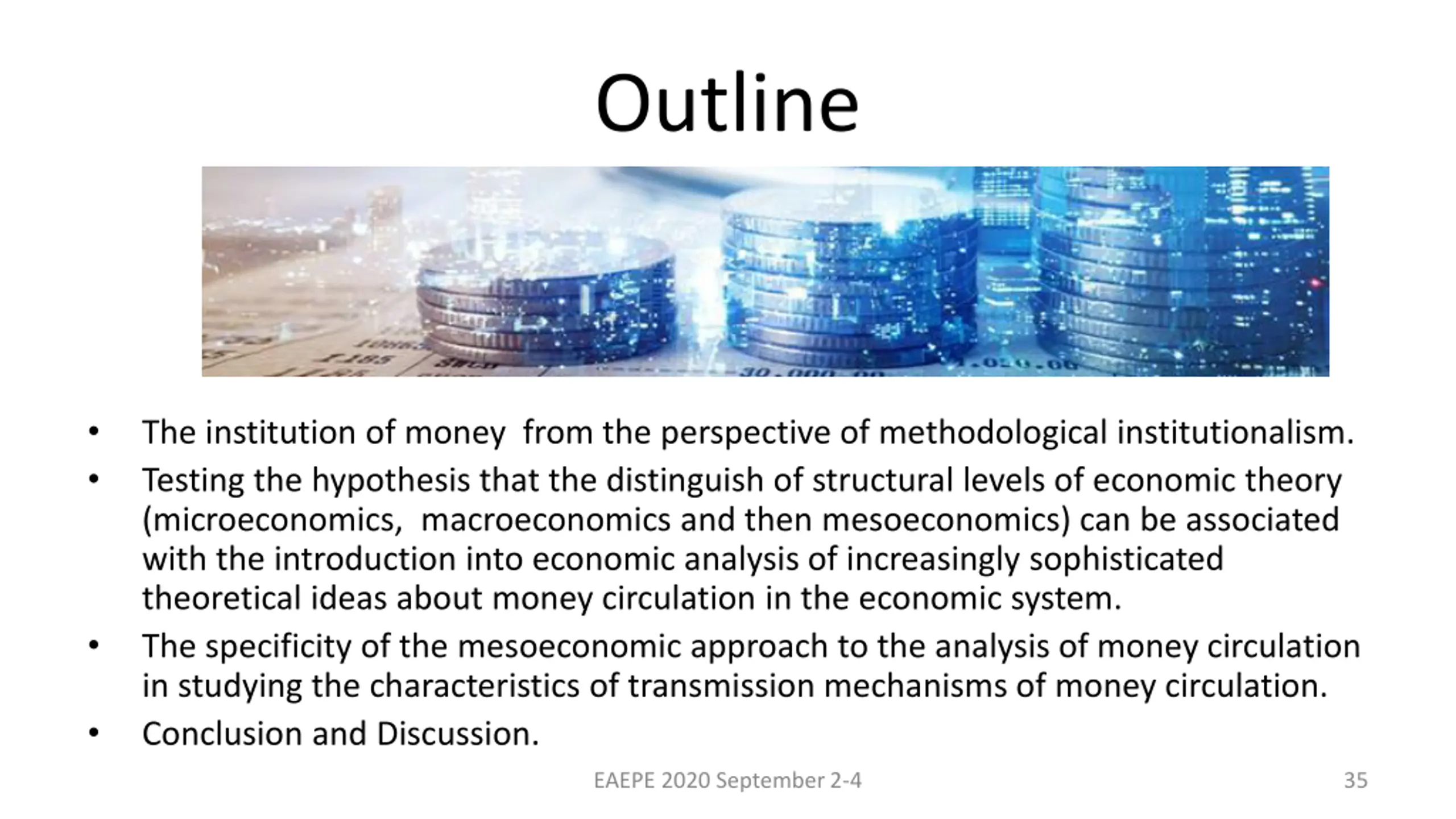 Outline The institution of money from the perspective of methodological institutionalism. Testing the hypothesis that the distinguish of structural levels of economic theory (microeconomics, macroeconomics and then mesoeconomics) can be associated with the introduction into economic analysis of increasingly sophisticated theoretical ideas about money circulation in the economic system. The specificity of the mesoeconomic approach to the analysis of money circulation in studying the characteristics of transmission mechanisms of money circulation. Conclusion and Discussion. EAEPE 2020 September 2-4 35