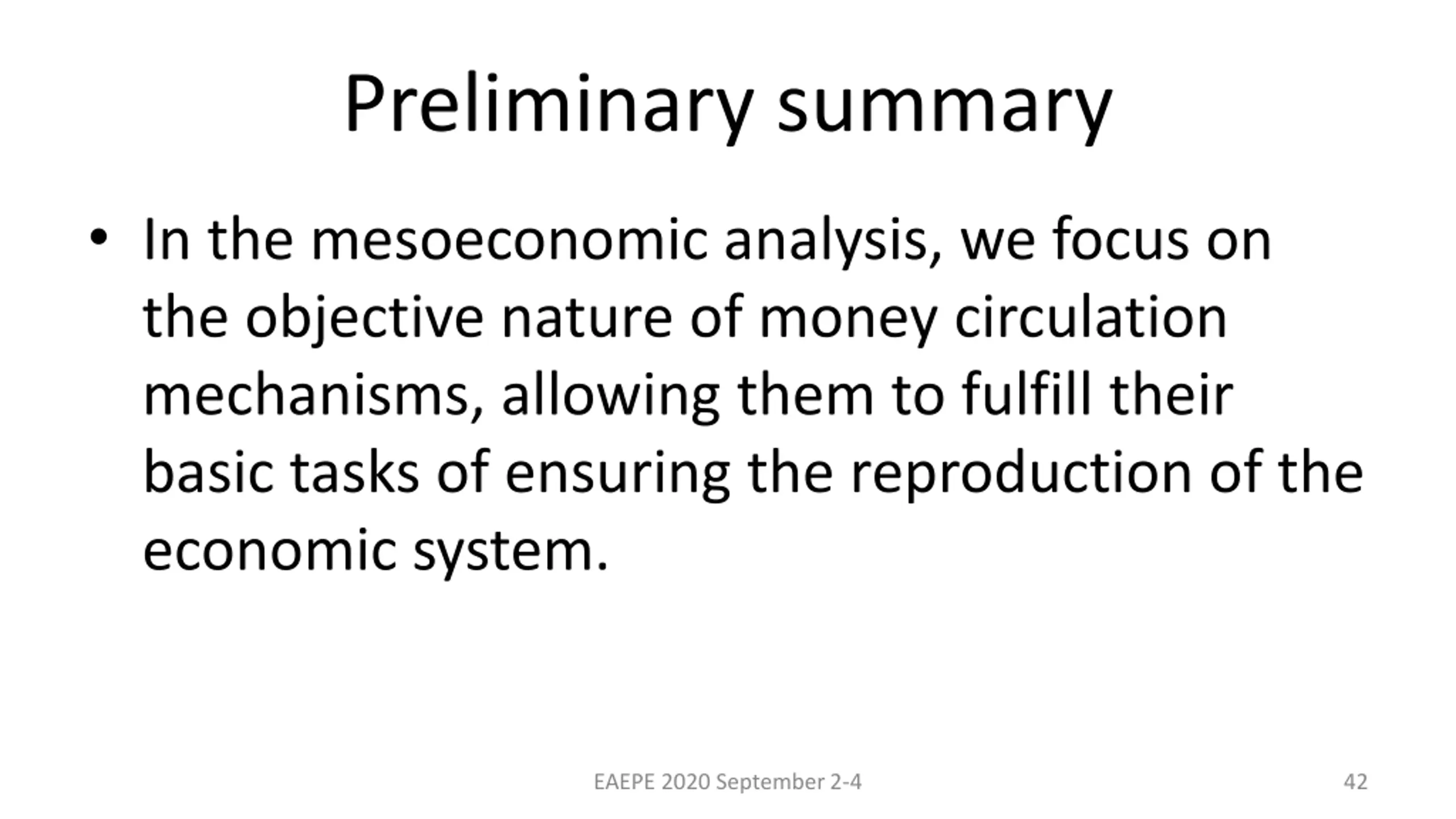 Preliminary summary In the mesoeconomic analysis, we focus on the objective nature of money circulation mechanisms, allowing them to fulfill their basic tasks of ensuring the reproduction of the economic system. EAEPE 2020 September 2-4 42