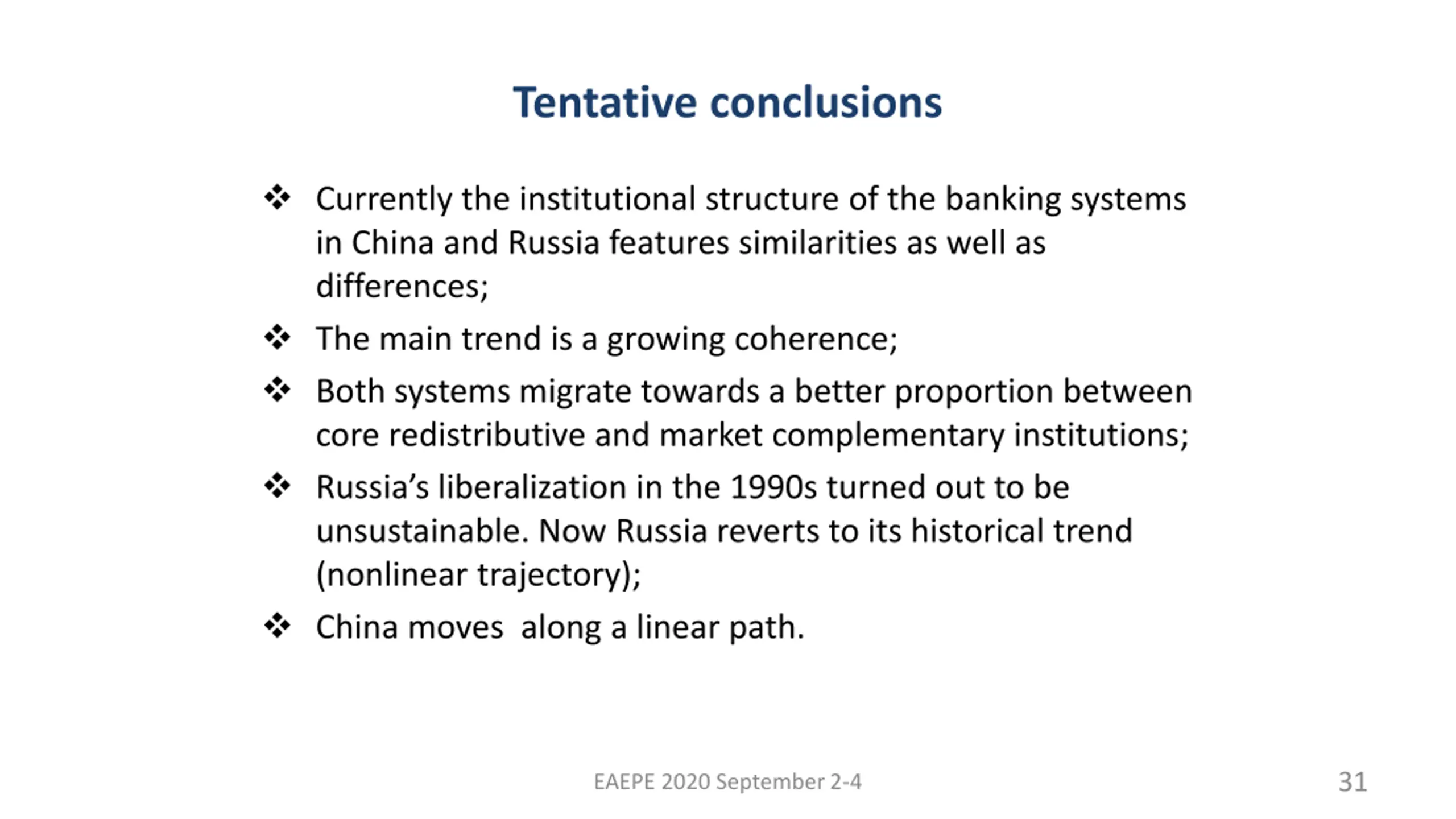 Tentative conclusions Currently the institutional structure of the banking systems in China and Russia features similarities as well as differences; The main trend is a growing coherence; Both systems migrate towards a better proportion between core redistributive and market complementary institutions; Russia s liberalization in the 1990s turned out to be unsustainable. Now Russia reverts to its historical trend (nonlinear trajectory); China moves along a linear path. 31 EAEPE 2020 September 2-4