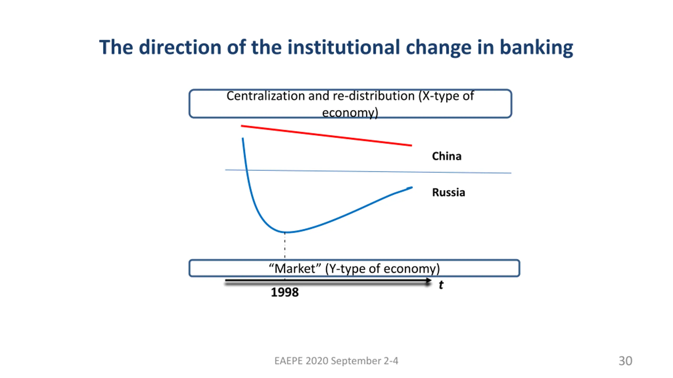 The direction of the institutional change in banking Centralization and re-distribution (X-type of economy) China Russia Market (Y-type of economy) t 1998 30 EAEPE 2020 September 2-4