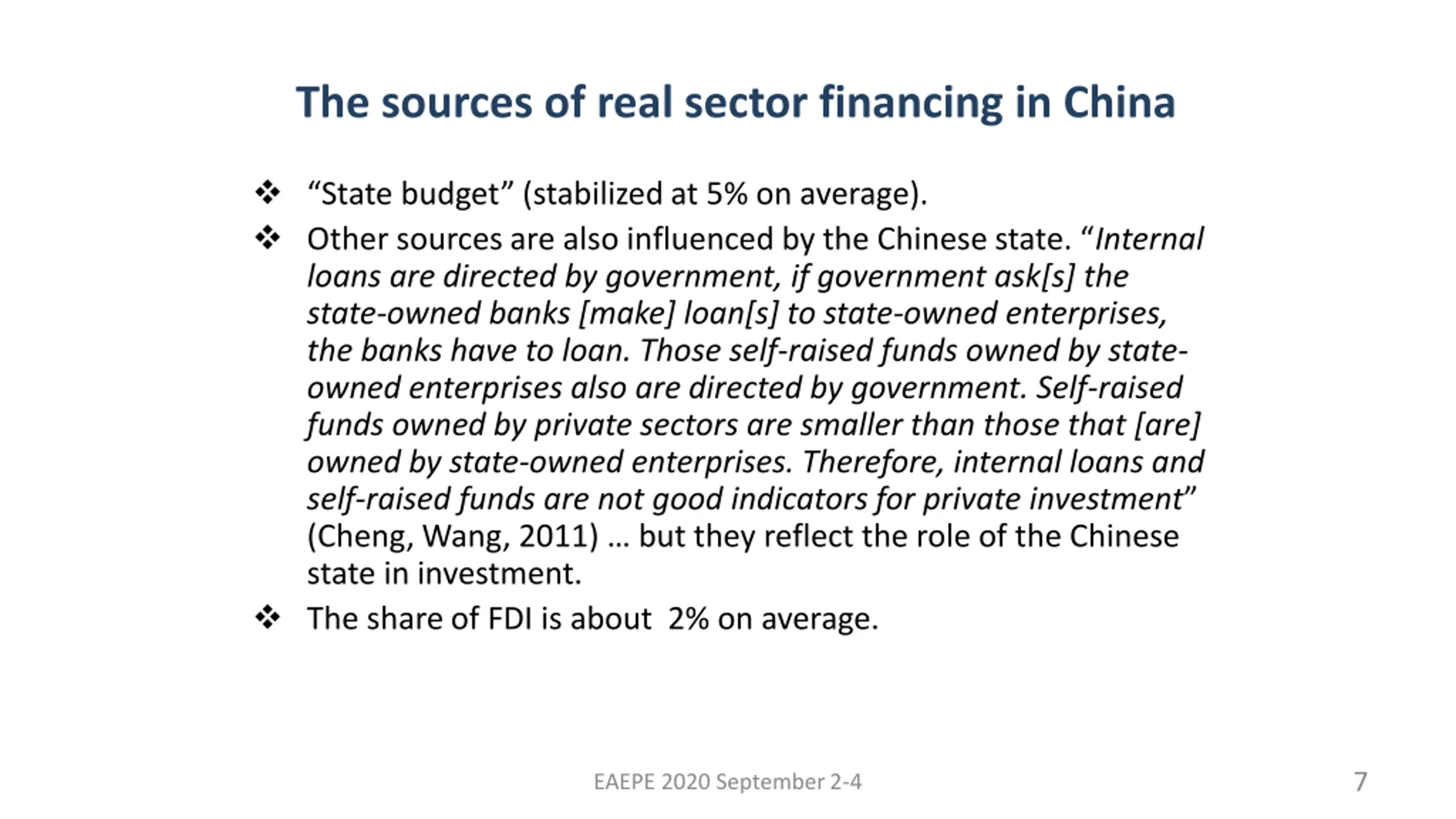The sources of real sector financing in China State budget (stabilized at 5% on average). Other sources are also influenced by the Chinese state. Internal loans are directed by government, if government ask[s] the state-owned banks [make] loan[s] to state-owned enterprises, the banks have to loan. Those self-raised funds owned by state- owned enterprises also are directed by government. Self-raised funds owned by private sectors are smaller than those that [are] owned by state-owned enterprises. Therefore, internal loans and self-raised funds are not good indicators for private investment (Cheng, Wang, 2011) but they reflect the role of the Chinese state in investment. The share of FDI is about 2% on average. 7 EAEPE 2020 September 2-4