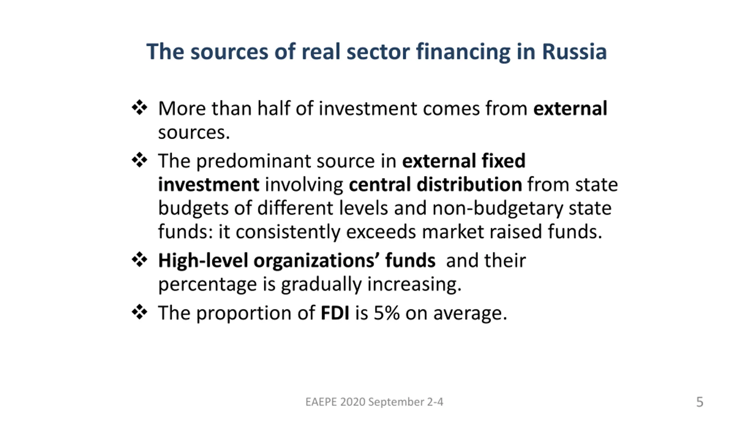The sources of real sector financing in Russia More than half of investment comes from external sources. The predominant source in external fixed investment involving central distribution from state budgets of different levels and non-budgetary state funds: it consistently exceeds market raised funds. High-level organizations funds and their percentage is gradually increasing. The proportion of FDI is 5% on average. 5 EAEPE 2020 September 2-4