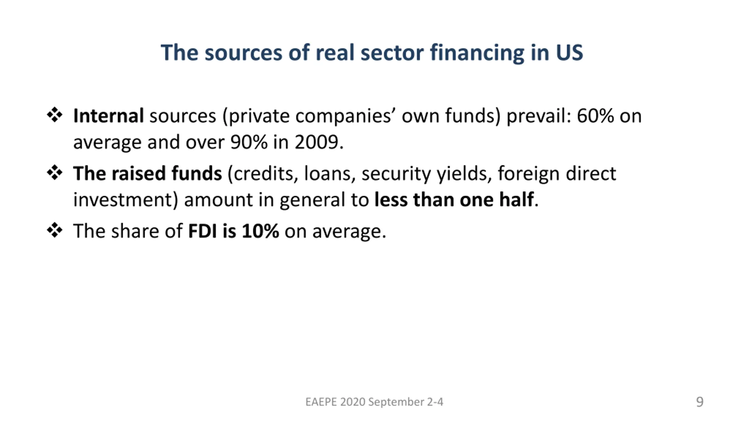 The sources of real sector financing in US Internal sources (private companies own funds) prevail: 60% on average and over 90% in 2009. The raised funds (credits, loans, security yields, foreign direct investment) amount in general to less than one half. The share of FDI is 10% on average. 9 EAEPE 2020 September 2-4
