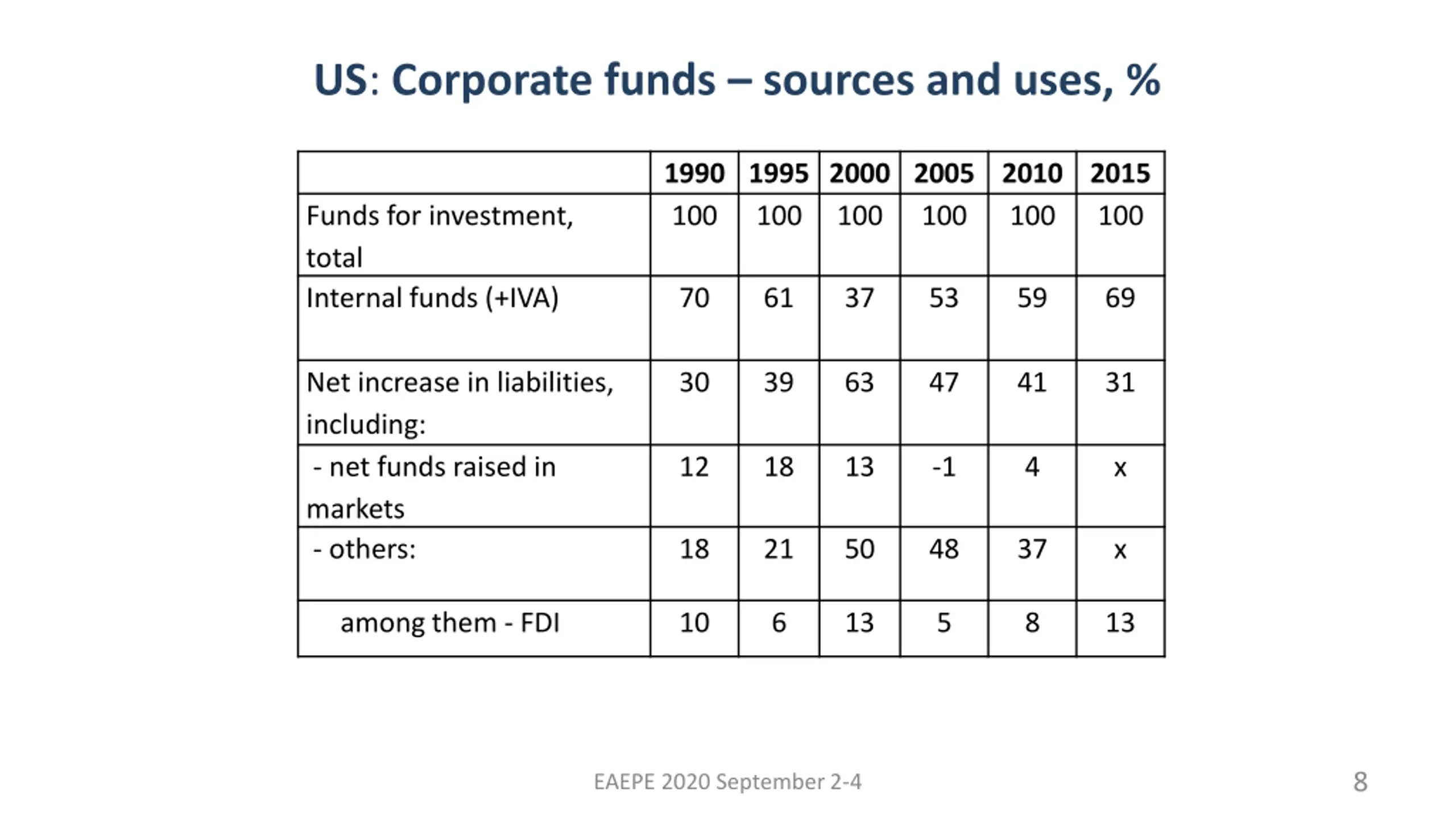 US: Corporate funds sources and uses, % 1990 1995 2000 2005 2010 2015 100 100 100 Funds for investment, total Internal funds (+IVA) 100 100 100 70 61 37 53 59 69 Net increase in liabilities, including: - net funds raised in markets - others: 30 39 63 47 41 31 12 18 13 -1 4 x 18 21 50 48 37 x among them - FDI 10 6 13 5 8 13 8 EAEPE 2020 September 2-4
