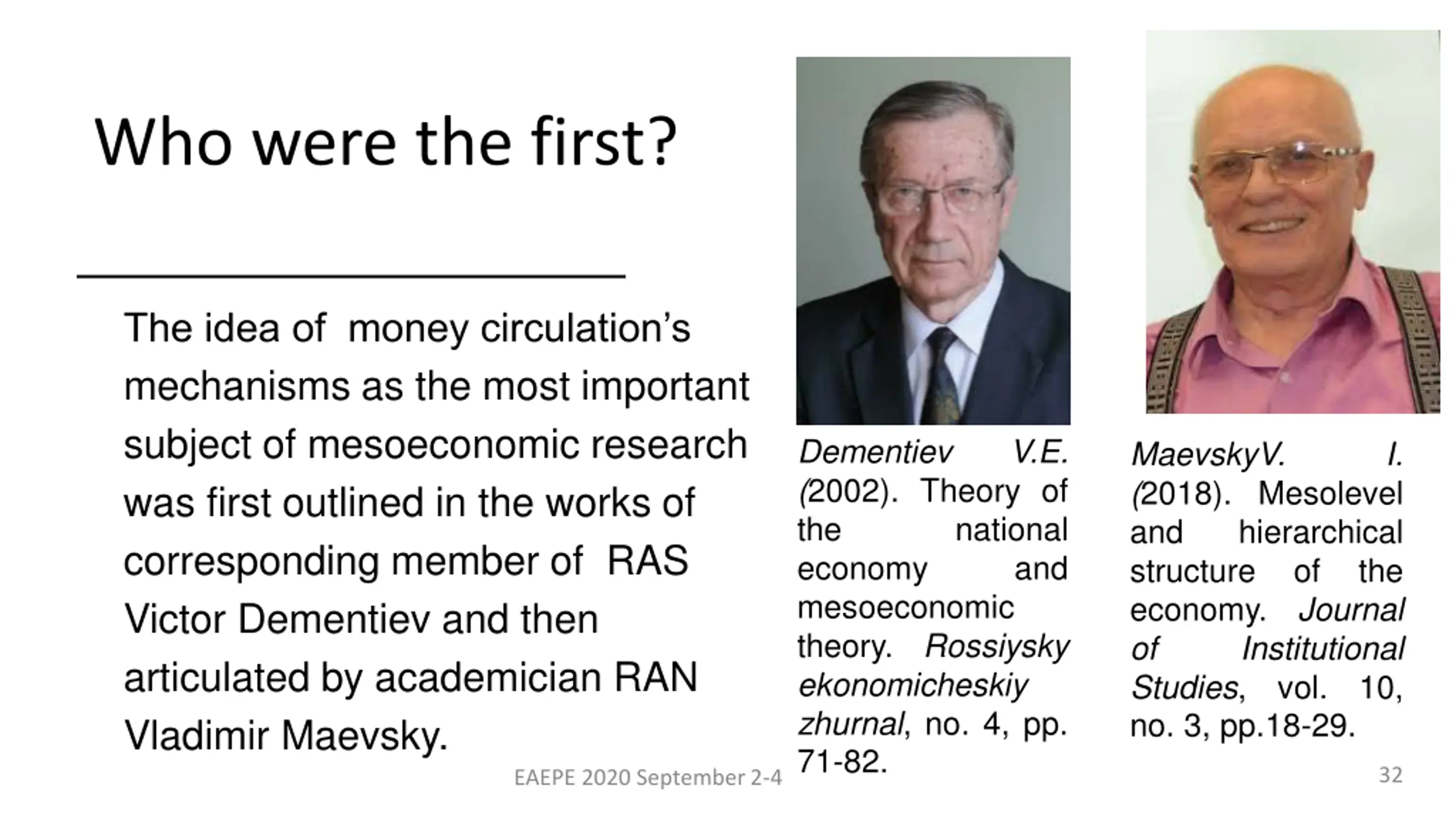 Who were the first? The idea of money circulation s mechanisms as the most important subject of mesoeconomic research was first outlined in the works of corresponding member of RAS Victor Dementiev and then articulated by academician RAN Vladimir Maevsky. Dementiev (2002). Theory of the economy mesoeconomic theory. Rossiysky ekonomicheskiy zhurnal, no. 4, pp. 71-82. V.E. MaevskyV. (2018). Mesolevel and hierarchical structure economy. of Institutional Studies, no. 3, pp.18-29. I. national and of Journal the vol. 10, 32 EAEPE 2020 September 2-4