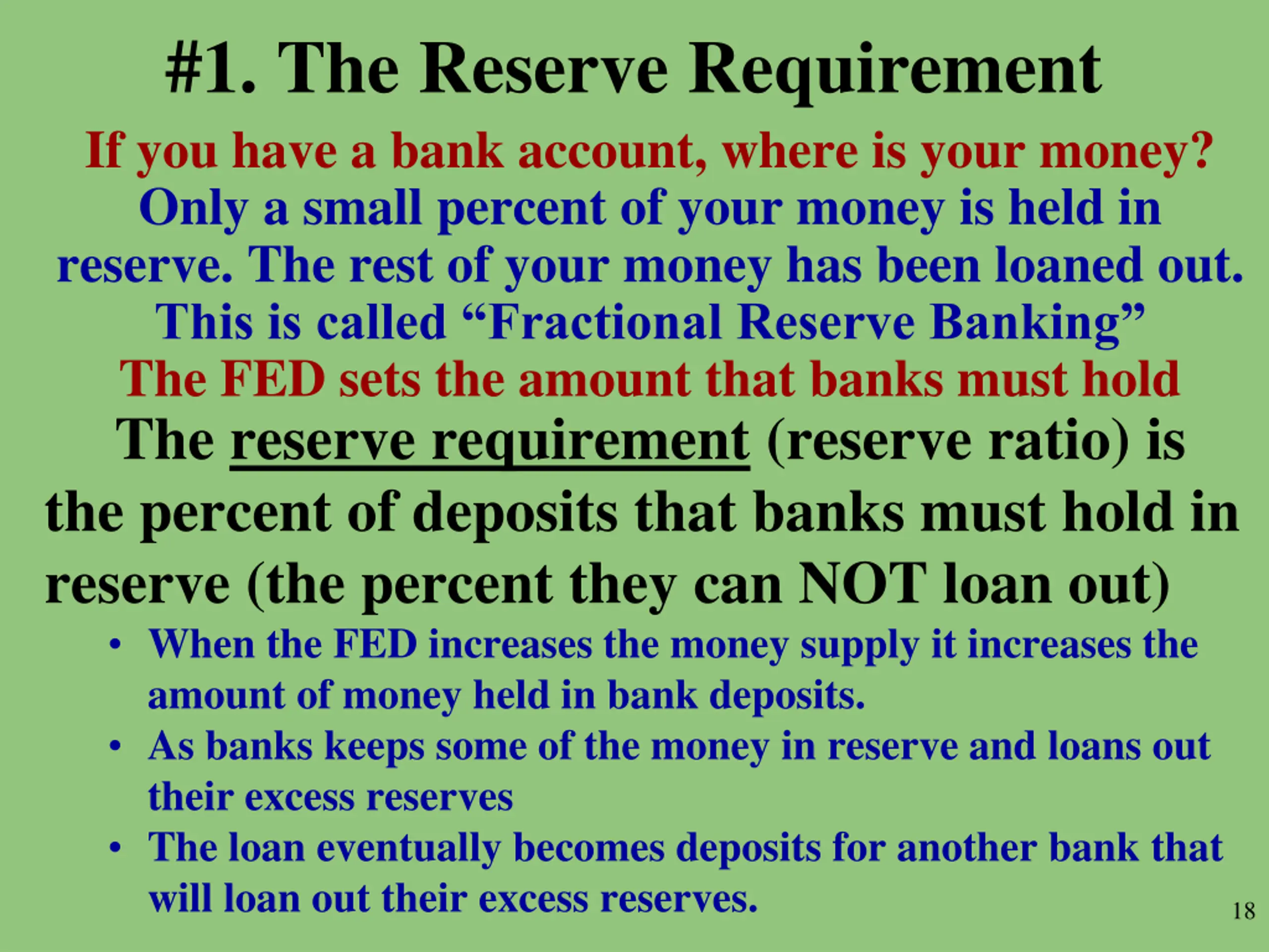 #1. The Reserve Requirement If you have a bank account, where is your money? Only a small percent of your money is held in reserve. The rest of your money has been loaned out. This is called Fractional Reserve Banking The FED sets the amount that banks must hold The reserve requirement (reserve ratio) is the percent of deposits that banks must hold in reserve (the percent they can NOT loan out) When the FED increases the money supply it increases the amount of money held in bank deposits. As banks keeps some of the money in reserve and loans out their excess reserves The loan eventually becomes deposits for another bank that will loan out their excess reserves. 18
