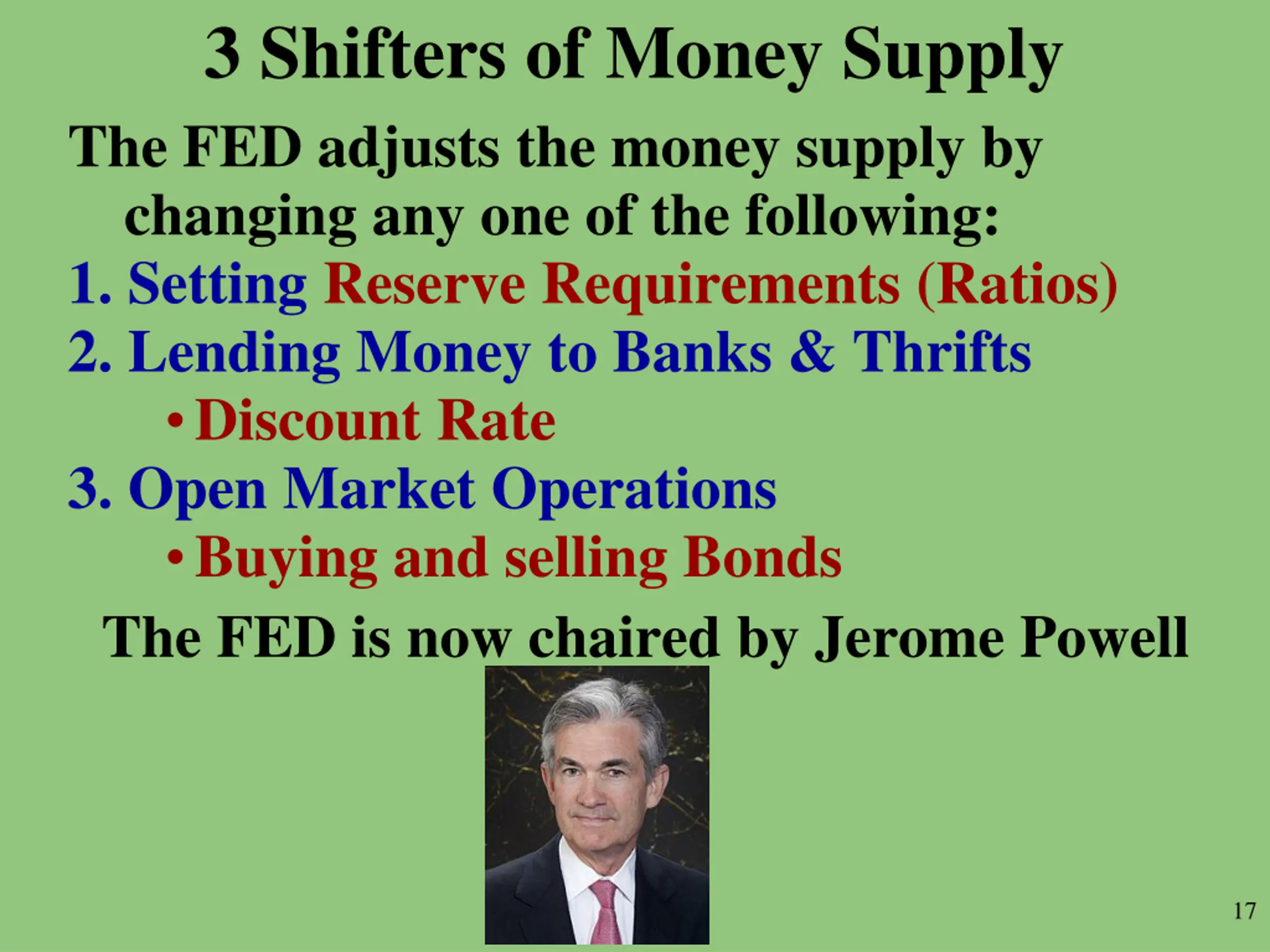 3 Shifters of Money Supply The FED adjusts the money supply by changing any one of the following: 1. Setting Reserve Requirements (Ratios) 2. Lending Money to Banks & Thrifts Discount Rate 3. Open Market Operations Buying and selling Bonds The FED is now chaired by Jerome Powell 17
