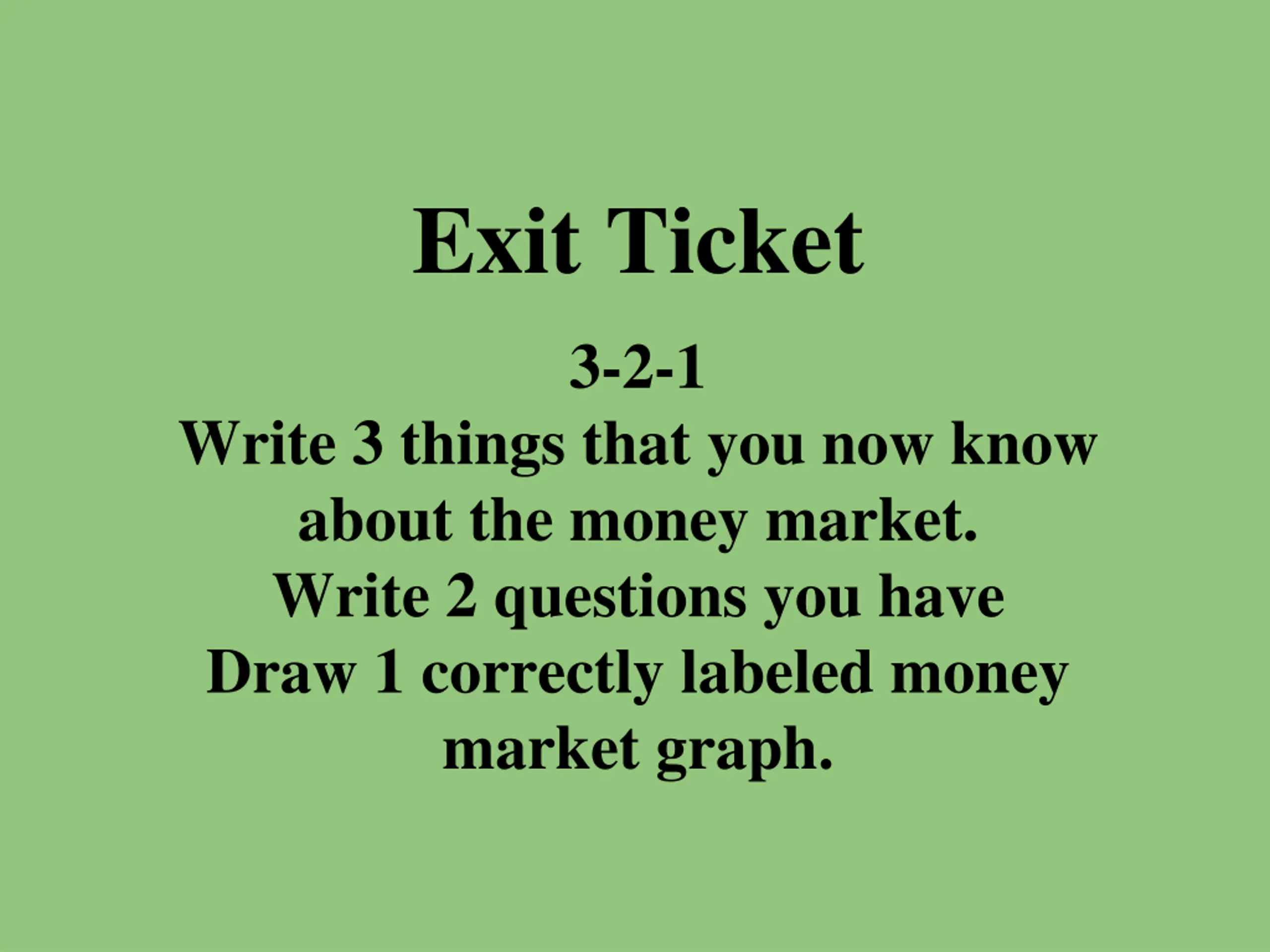 Exit Ticket 3-2-1 Write 3 things that you now know about the money market. Write 2 questions you have Draw 1 correctly labeled money market graph.