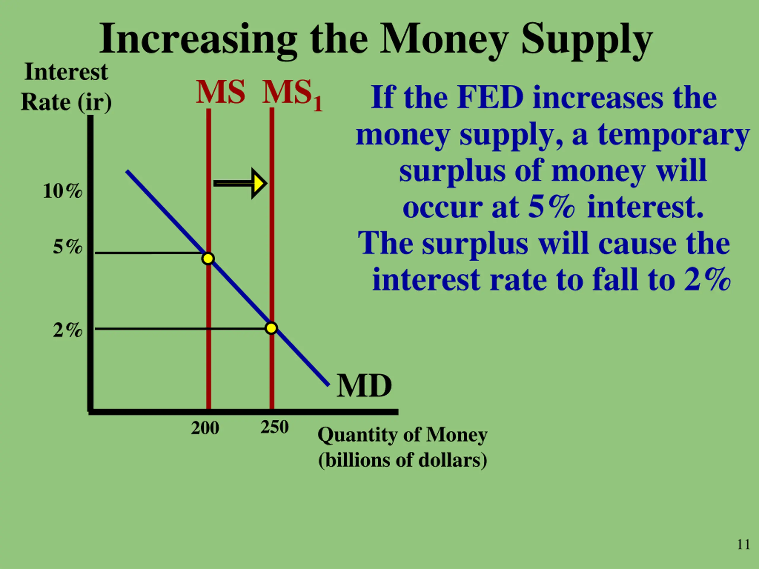 Increasing the Money Supply MS Rate (ir) MS1 Interest If the FED increases the money supply, a temporary surplus of money will occur at 5% interest. The surplus will cause the interest rate to fall to 2% 10% 5% 2% MD 250 200 Quantity of Money (billions of dollars) 11