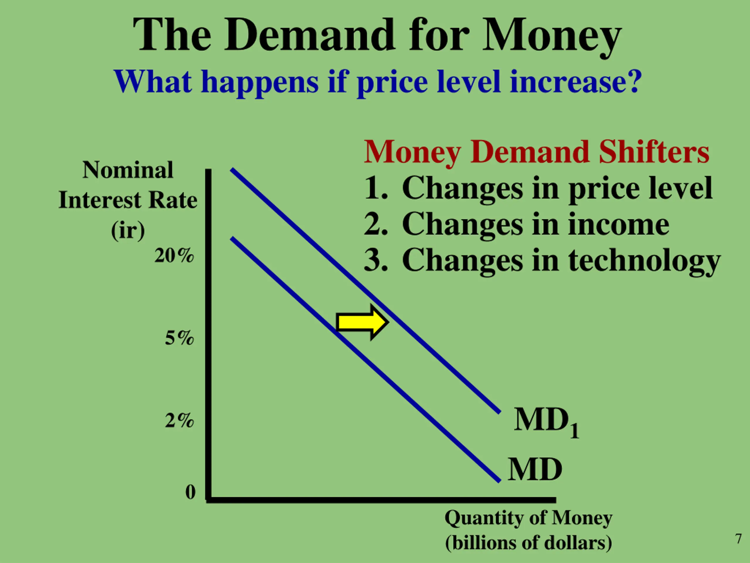 The Demand for Money Inverse relationship between interest rates and the quantity of money demanded Nominal Interest Rate (ir) 20% 5% 2% MD 0 Quantity of Money (billions of dollars) 6