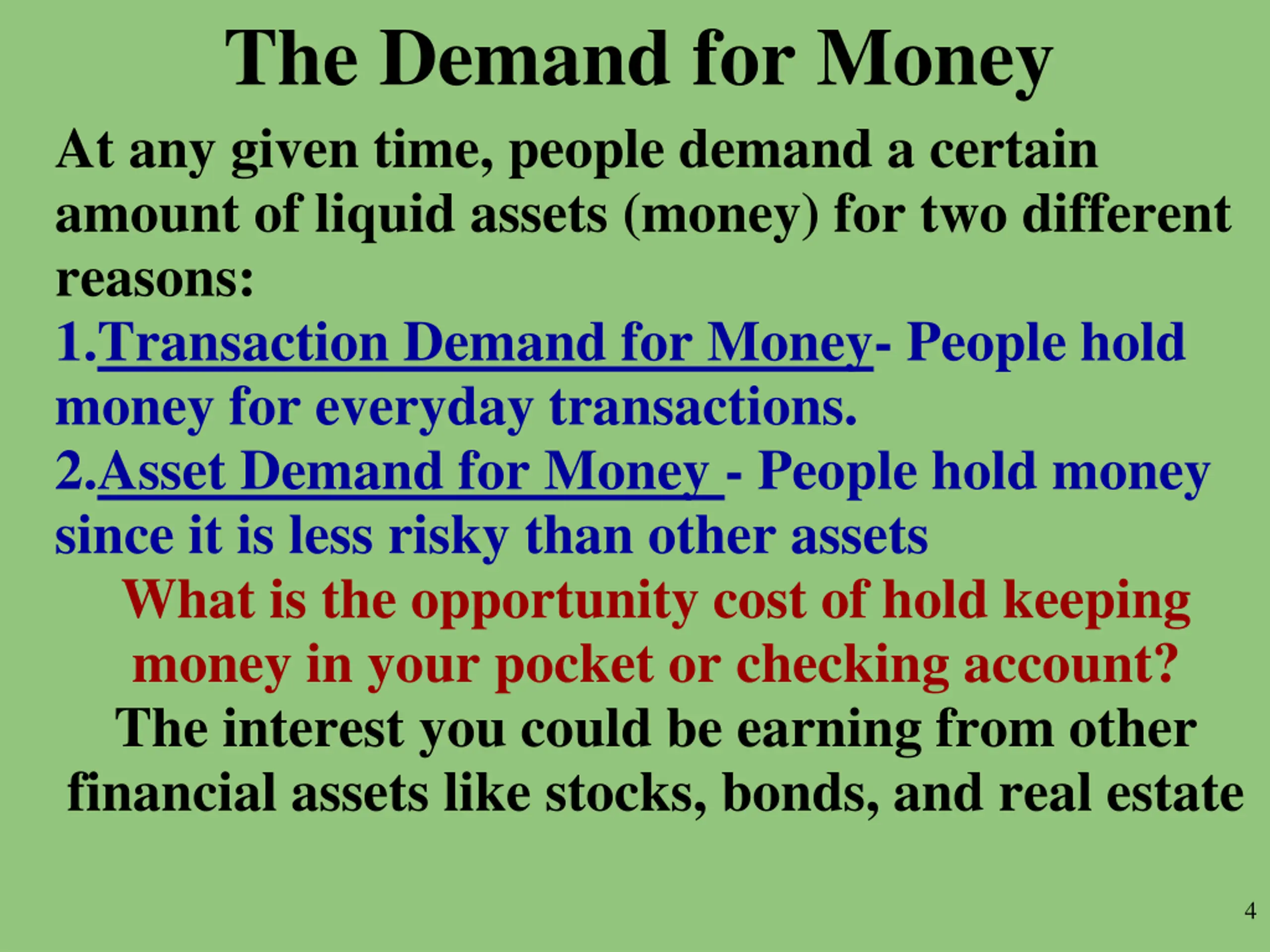 The Demand for Money At any given time, people demand a certain amount of liquid assets (money) for two different reasons: 1.Transaction Demand for Money- People hold money for everyday transactions. 2.Asset Demand for Money - People hold money since it is less risky than other assets What is the opportunity cost of hold keeping money in your pocket or checking account? The interest you could be earning from other financial assets like stocks, bonds, and real estate 4