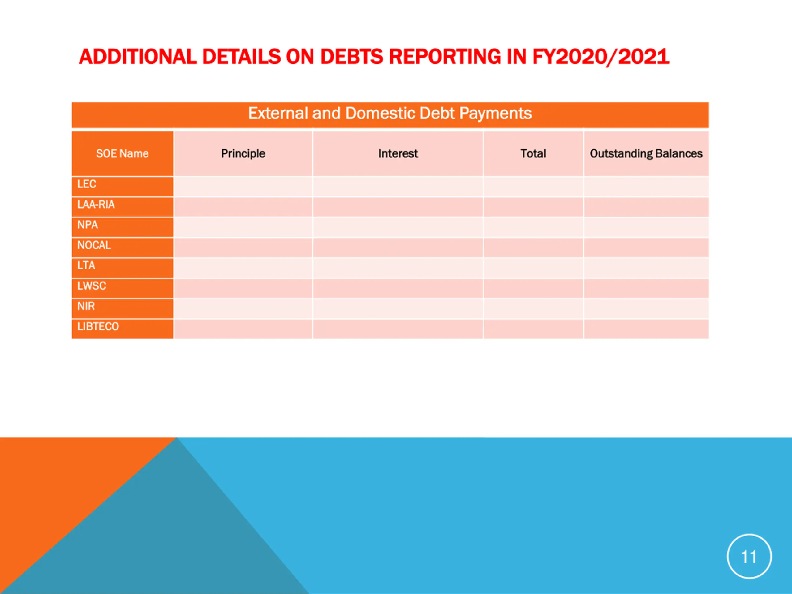 ADDITIONAL DETAILS ON DEBTS REPORTING IN FY2020/2021 ADDITIONAL DETAILS ON DEBTS REPORTING IN FY2020/2021 External and Domestic Debt Payments External and Domestic Debt Payments Principle Principle Interest Interest Total Total Outstanding Balances Outstanding Balances SOE Name SOE Name LEC LEC LAA LAA- -RIA RIA NPA NPA NOCAL NOCAL LTA LTA LWSC LWSC NIR NIR LIBTECO LIBTECO 11