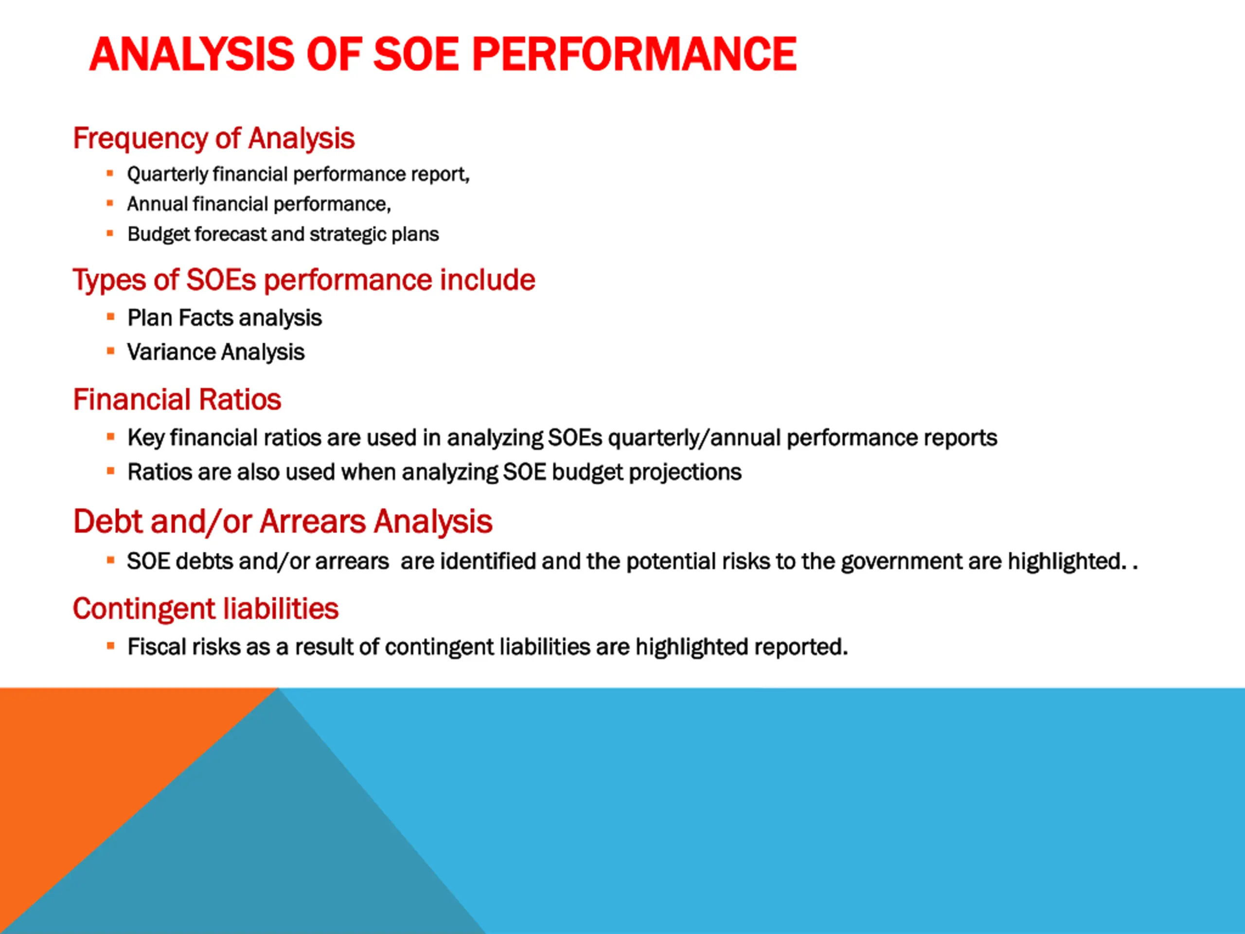 ANALYSIS OF SOE PERFORMANCE ANALYSIS OF SOE PERFORMANCE Frequency of Analysis Frequency of Analysis Quarterly Quarterly financial financial performance Annual Annual financial financial performance, Budget Budget forecast forecast and performance report, performance, and strategic strategic plans report, plans Types of SOEs performance include Types of SOEs performance include Plan Facts analysis Plan Facts analysis Variance Analysis Variance Analysis Financial Ratios Financial Ratios Key financial ratios are used in analyzing SOEs quarterly/annual performance reports Key financial ratios are used in analyzing SOEs quarterly/annual performance reports Ratios are also used when analyzing SOE budget projections Ratios are also used when analyzing SOE budget projections Debt and/or Arrears Analysis Debt and/or Arrears Analysis SOE debts and/or arrears are identified and the potential risks to the government are highlighted. . SOE debts and/or arrears are identified and the potential risks to the government are highlighted. . Contingent liabilities Contingent liabilities Fiscal risks as a result of contingent liabilities are highlighted reported. Fiscal risks as a result of contingent liabilities are highlighted reported.